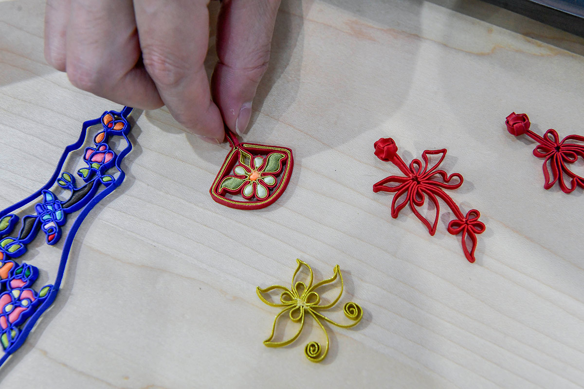 图为龙凤旗袍第四代传承人江满宗展示精美的旗袍盘扣。