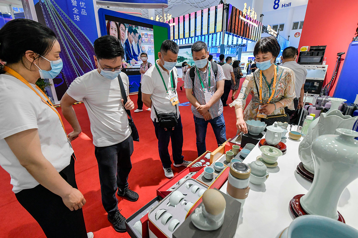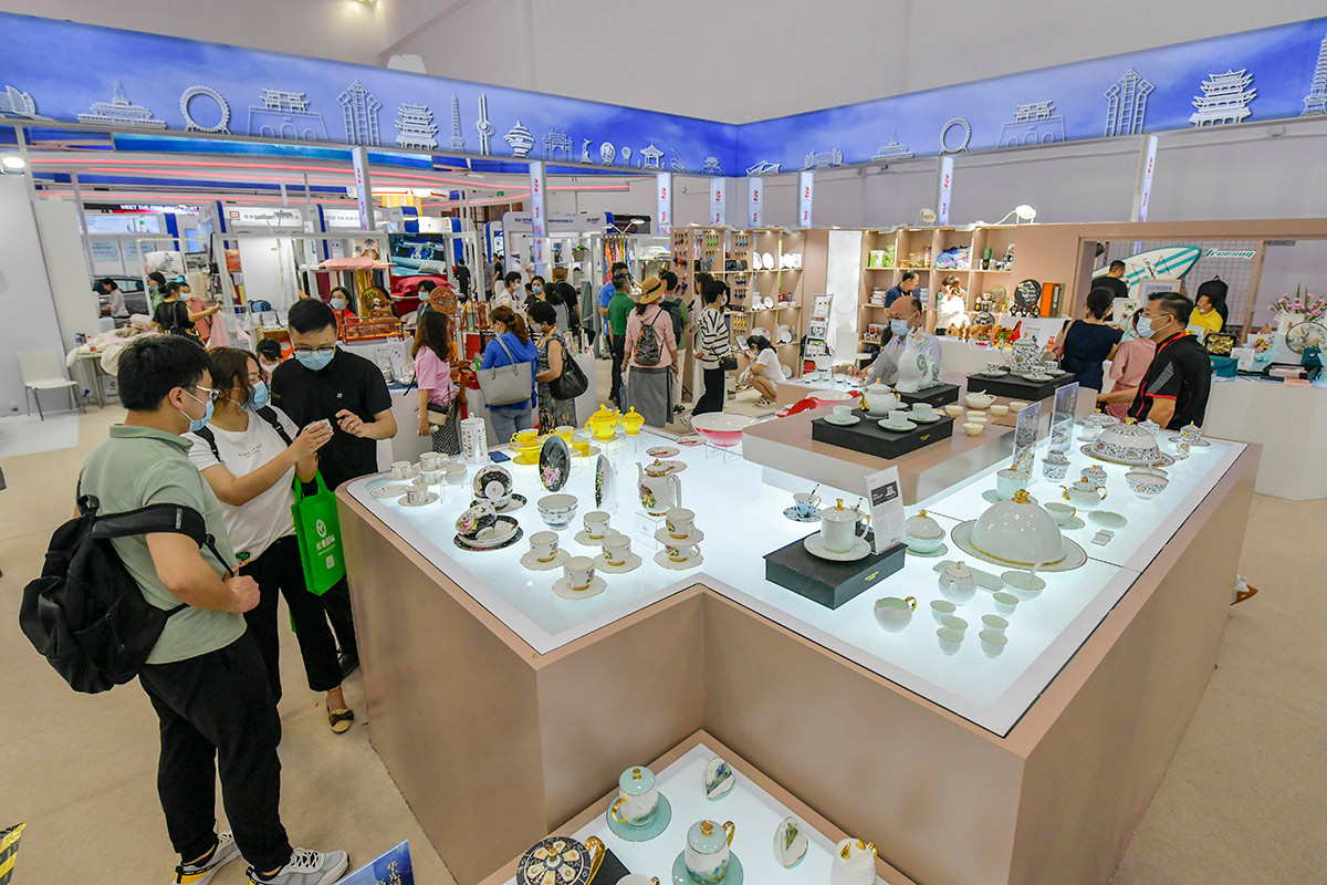 图为汝窑瓷质工艺品亮相河南馆,引参观者关注。