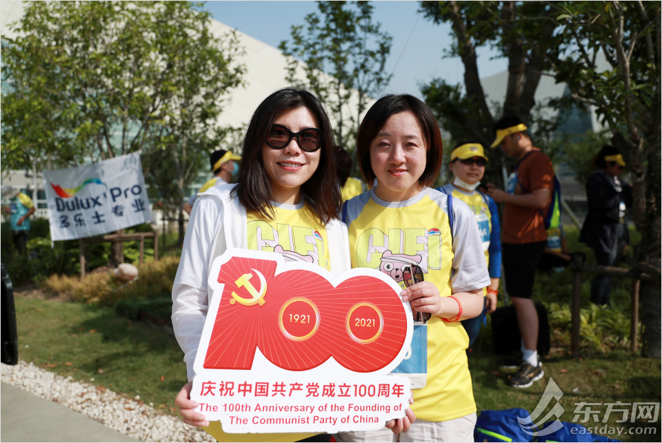 今年是中国共产党建党100周年。值此华诞之际,志愿者们身着“红军军装”, 在“徒步学党史”展板前,向参赛者娓娓讲述建党百年来重大的历史节点故事。