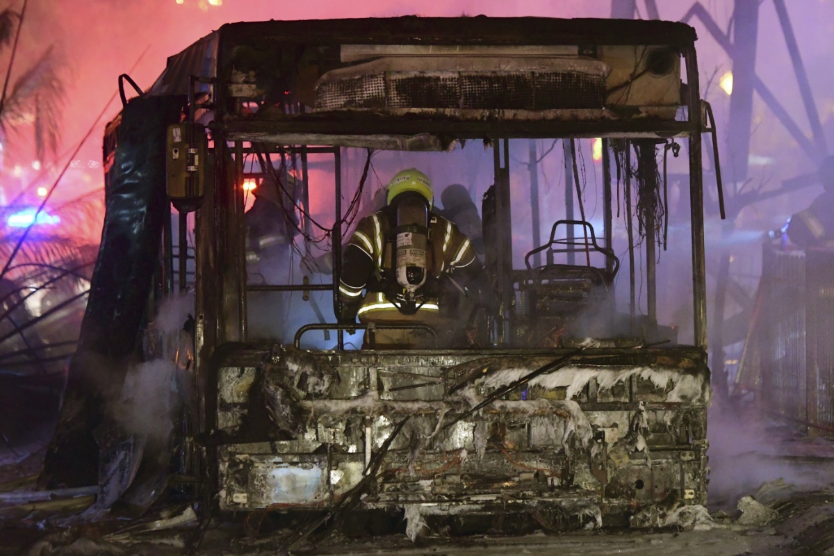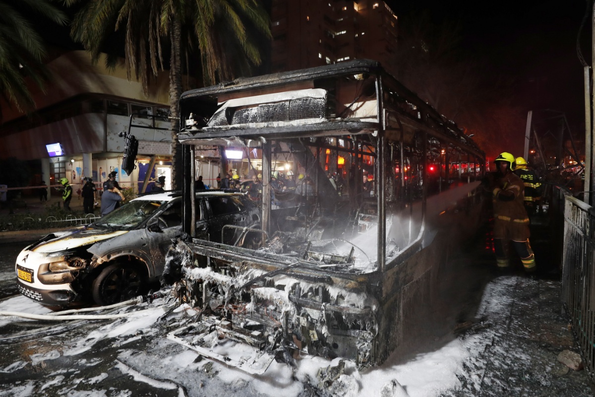 当地时间2021年5月11日,以色列特拉维夫郊区Holon,数颗火箭弹从加沙地带射向以色列特拉维夫及周边城镇,当地车辆受损严重,消防员在灭火。