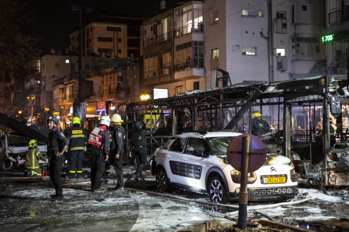 当地时间2021年5月11日,以色列特拉维夫郊区Holon,数颗火箭弹从加沙地带射向以色列特拉维夫及周边城镇,当地车辆受损严重,消防员在现场工作。
