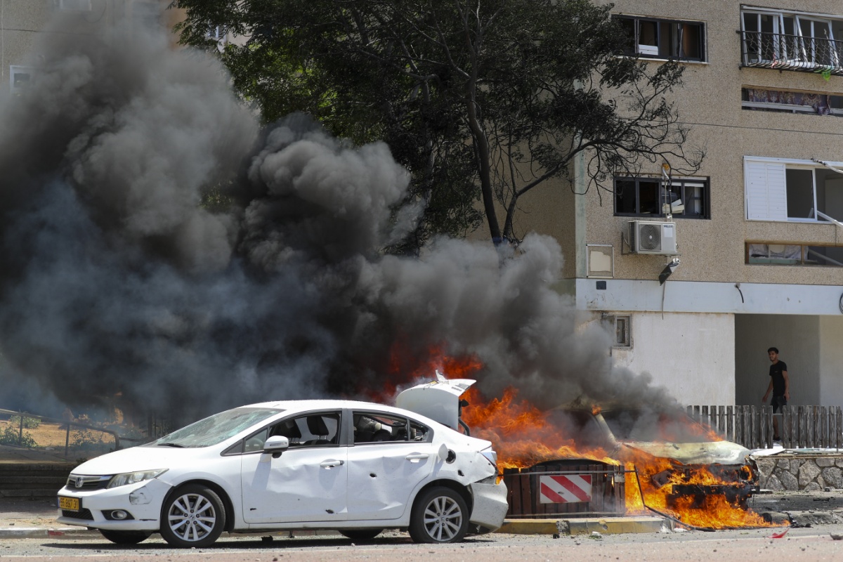当地时间2021年5月11日,以色列阿什凯隆,数颗火箭弹从加沙地带射向以色列特拉维夫及周边城镇,汽车着火。