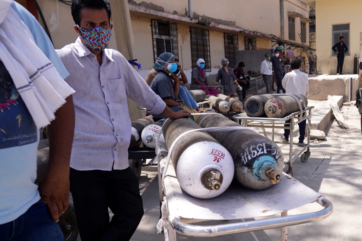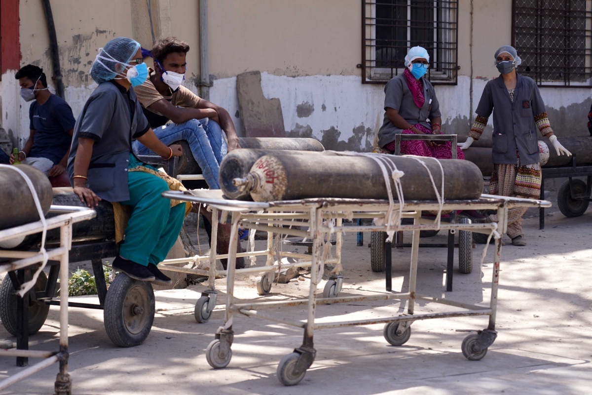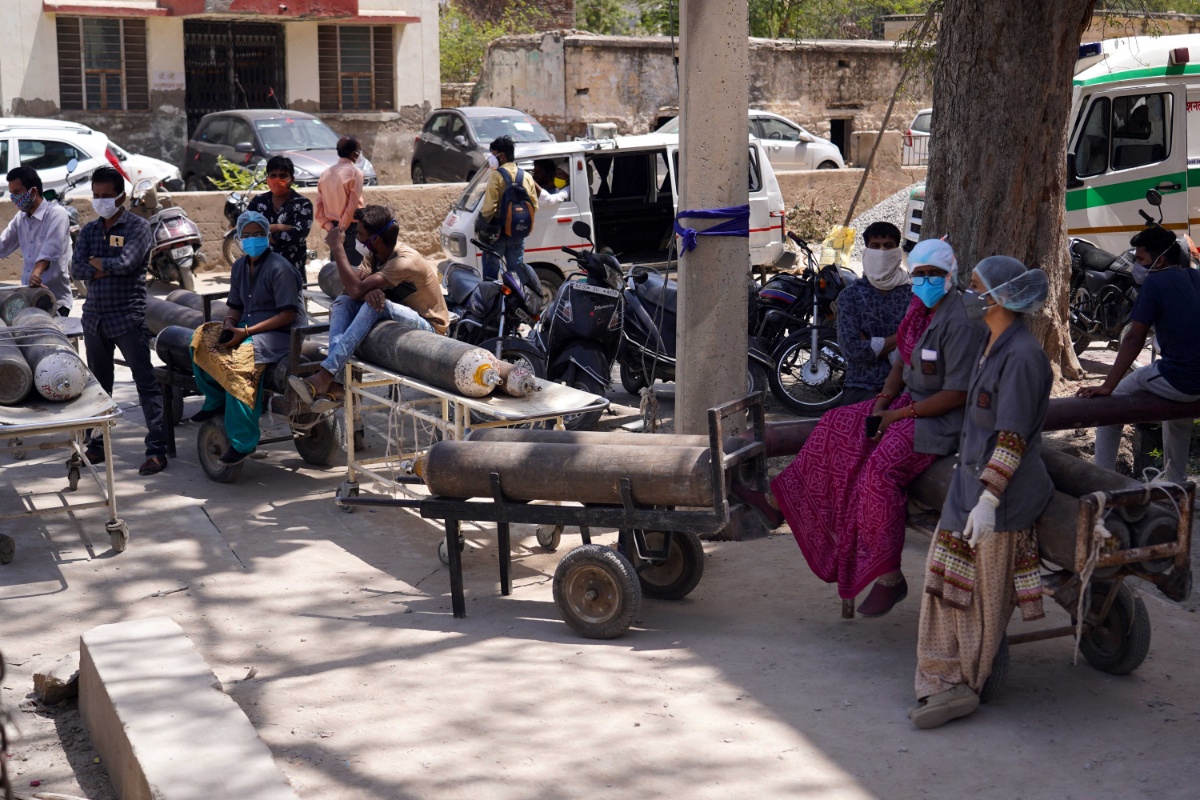 当地时间2021年5月11日,印度拉贾斯坦邦,民众等候为新冠患者补充医用氧气瓶。