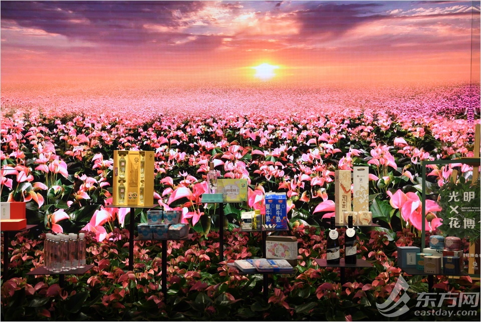 花团锦簇的微型展区中,汇集了光明集团与花博会IP联名出品的30多款创新产品。