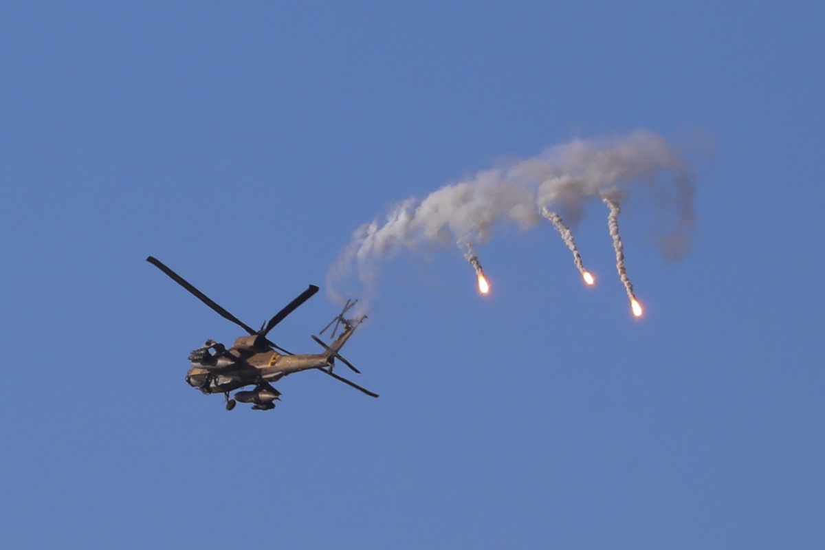 当地时间2021年5月13日,以色列边境,以色列直升机发射信号弹。据报道,巴以冲突升级,爆发猛烈交火。