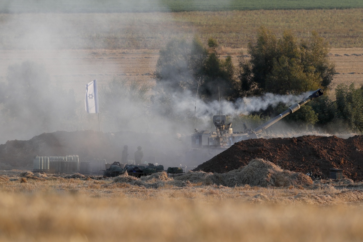 当地时间2021年5月13日,以色列边境,以色列炮兵向加沙地带进行发射。据报道,巴以冲突升级,爆发猛烈交火。