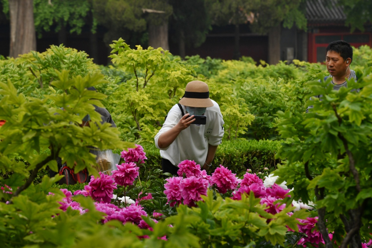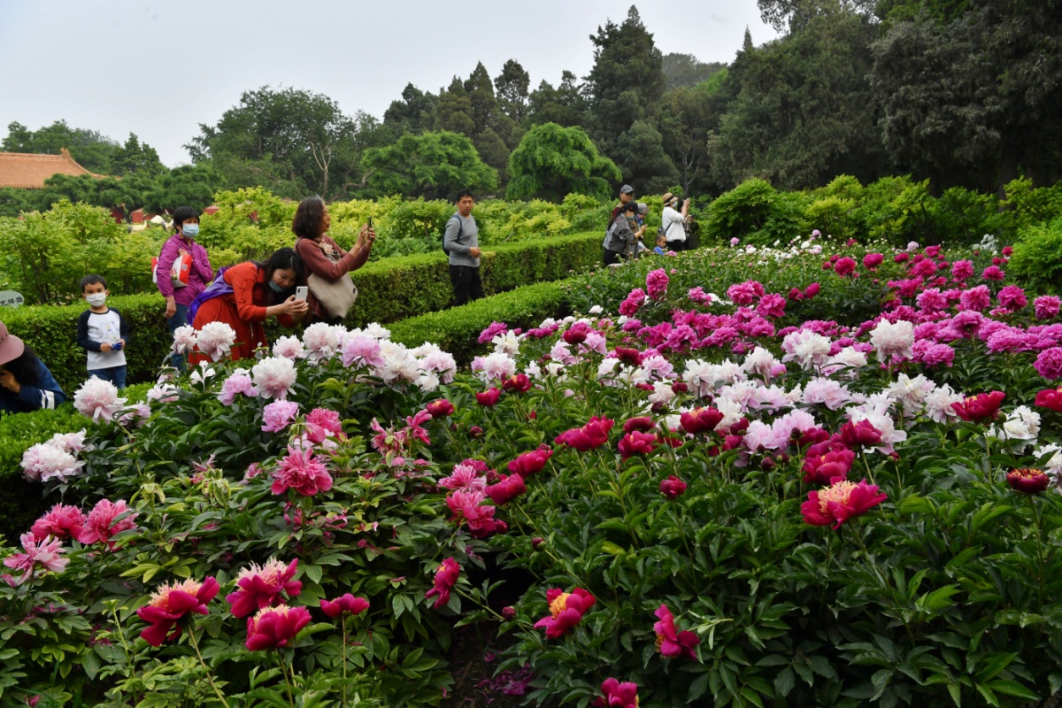 2021年5月13日傍晚,北京景山公园东门内,游客在欣赏盛开的芍药花。今年,景山公园汇集了318种、两万余墩的芍药,其中国内芍药167种,进口品种芍药151种,品种数量均为历年之最。