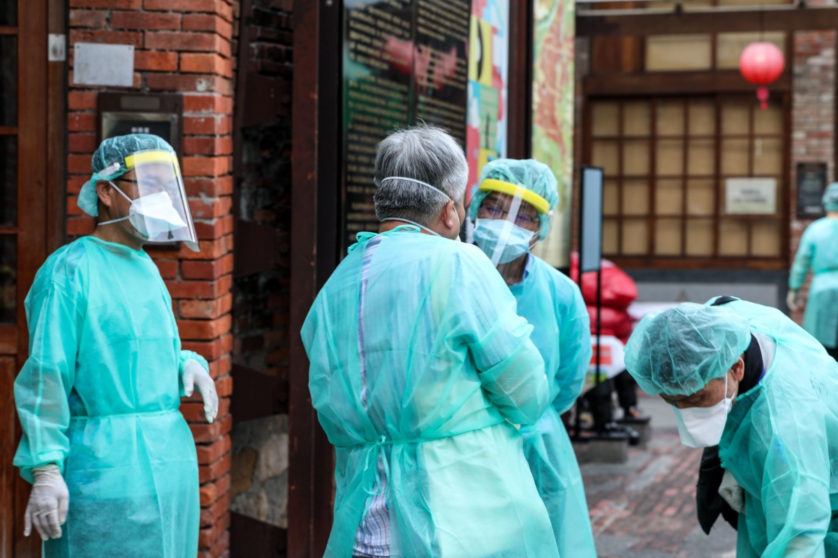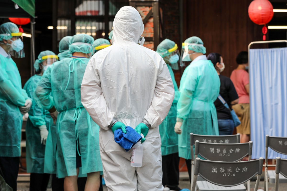 2021年5月15日,中国台湾,台湾地区流行疫情指挥中心15日介绍,台湾14日单日新增180例本土新冠肺炎确诊病例、境外输入5例。指挥中心宣布全面提升台湾防疫举措。疫情相对较重的北部县市如临大敌。台北市14日起开设4处免费快筛站, 呼吁有症状的人尽快筛检。图为台北市万华区核酸检测免费快筛站的医护人员。