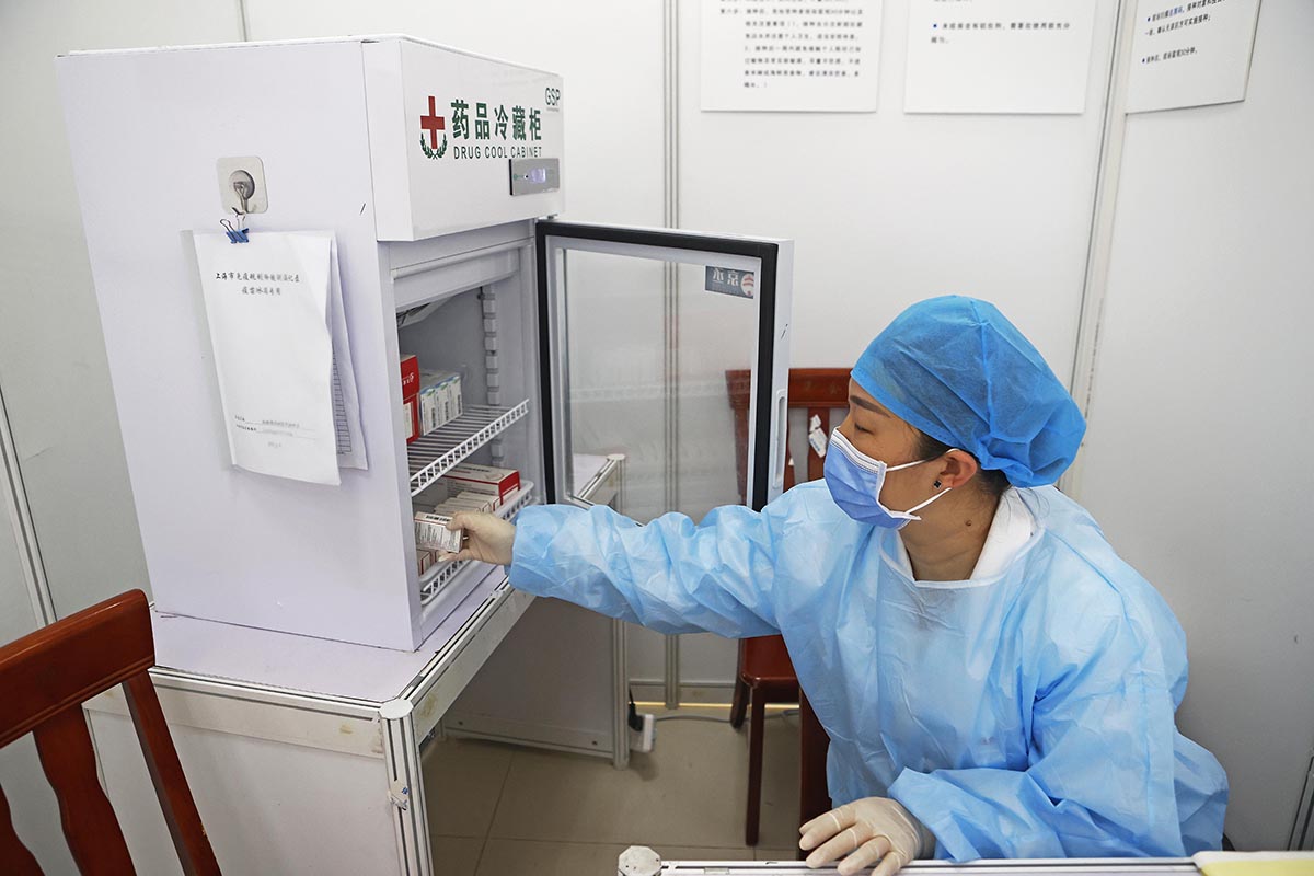 2021年5月18日,医护人员在嘉定区静华会所临时接种点整理新冠疫苗。记者从上海市疾控中心获悉,近日上海市各区已陆续开始供应该疫苗。
