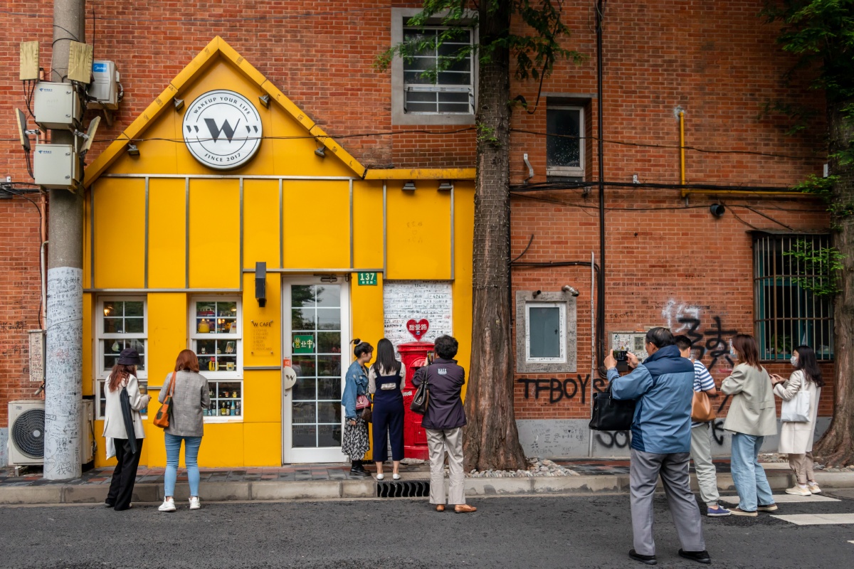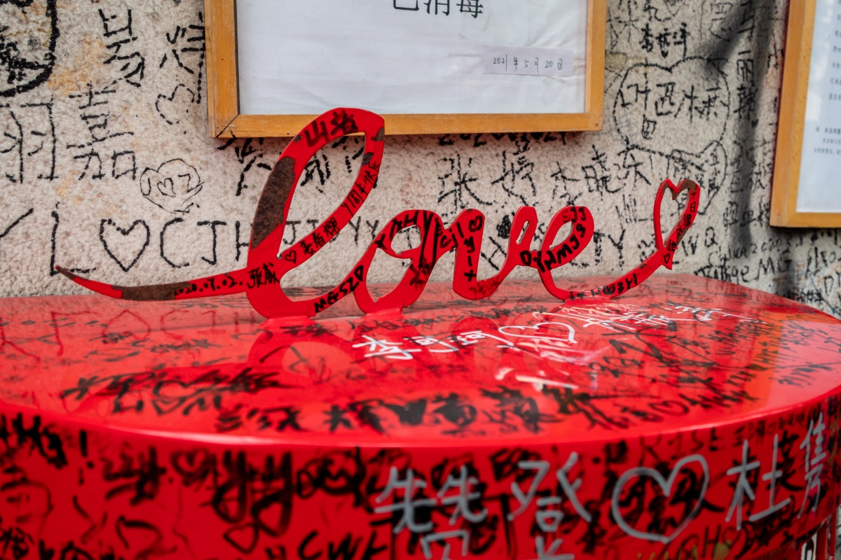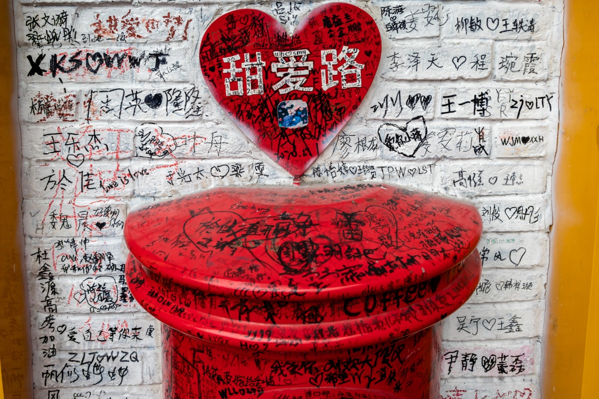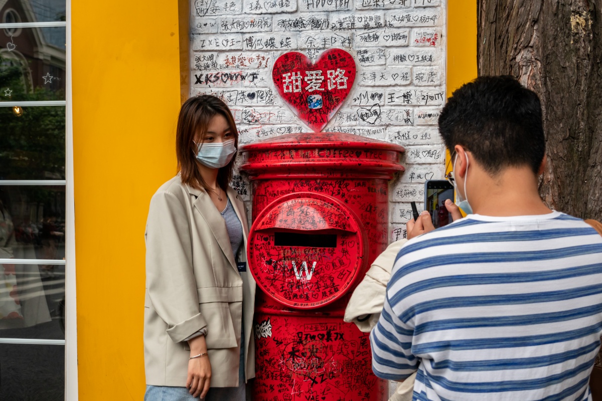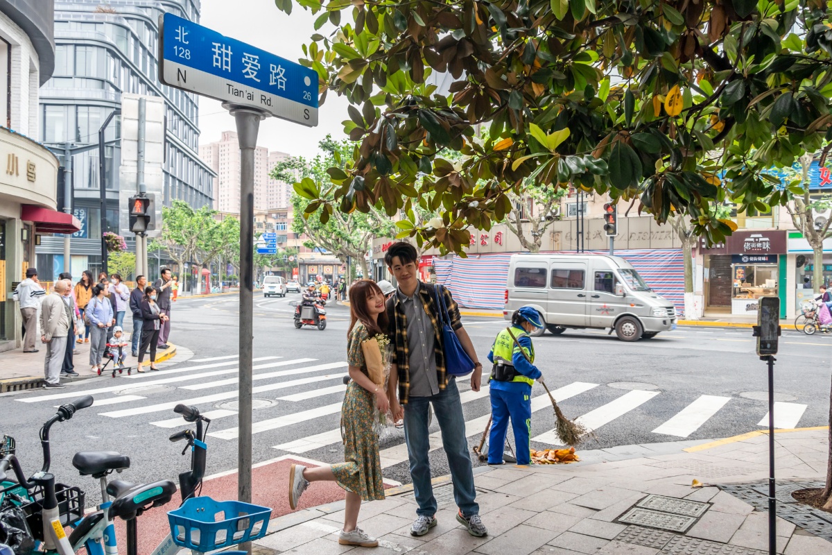 2021年5月20日,上海,今天是“520”网络情人节,中午时分,有上海最“甜”的马路之称的甜爱路上,不少情侣和市民专程前来打卡。520前夕,甜爱路完成了大修,马路路面重新进行沥青铺设,西侧设置了红色沥青路面,人行道更换了彩色钢渣透水砖,树篦子全面更新,公交站台地面用彩砖拼出“LOVE IN TIAN AI”字样。大修后,甜爱路将注入更多的爱情元素,更加“甜甜蜜蜜”。