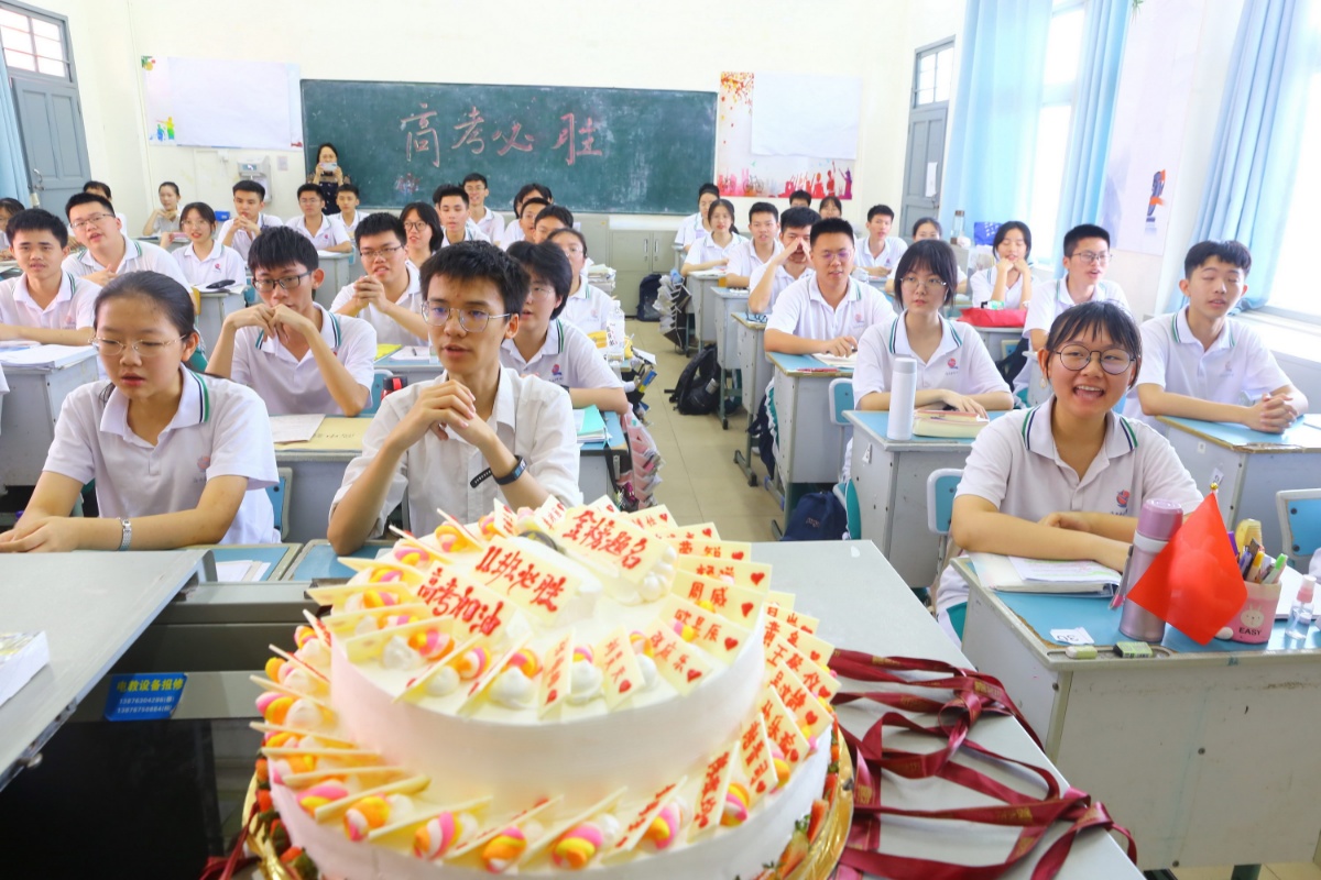 2021年6月2日,海南海口,距离高考5天,海南侨中高三11班细心的班主任特意给即将参加高考的49名考生准备送“好事连连”红包和刻了每一位考生名字的蛋糕,祝福考生们高考顺利、必胜!