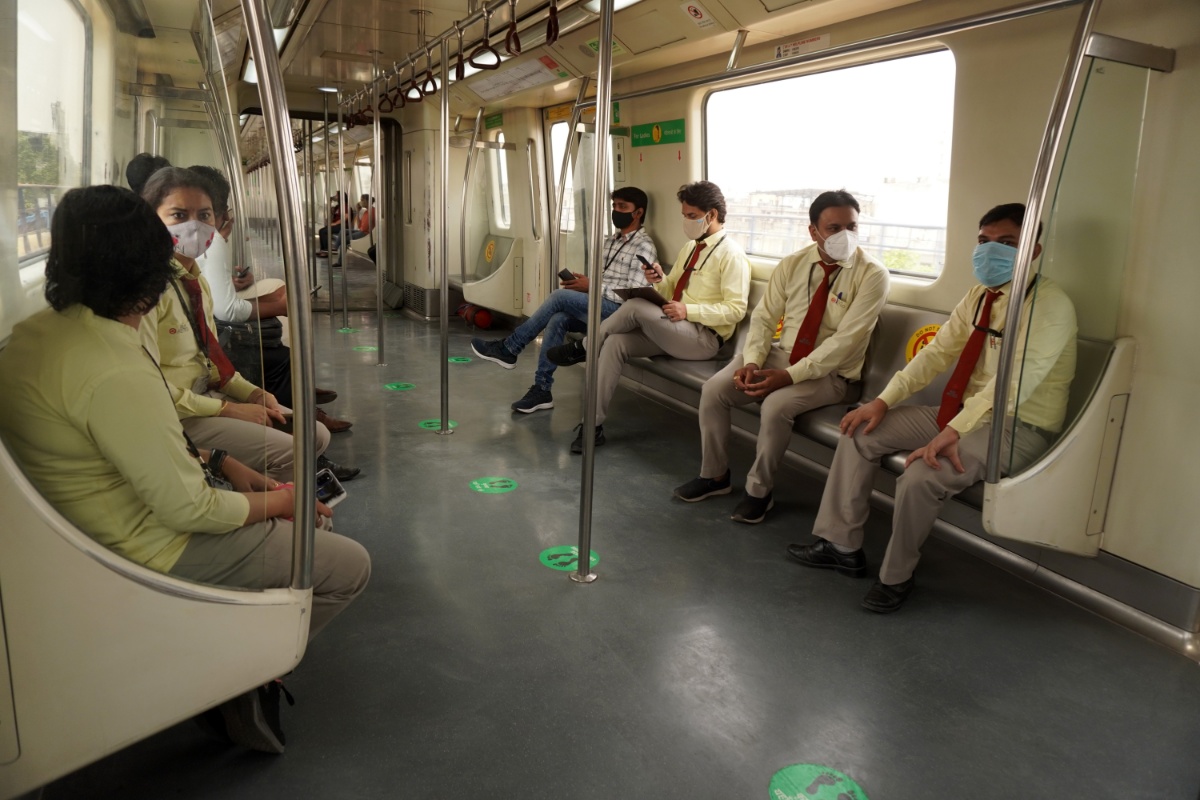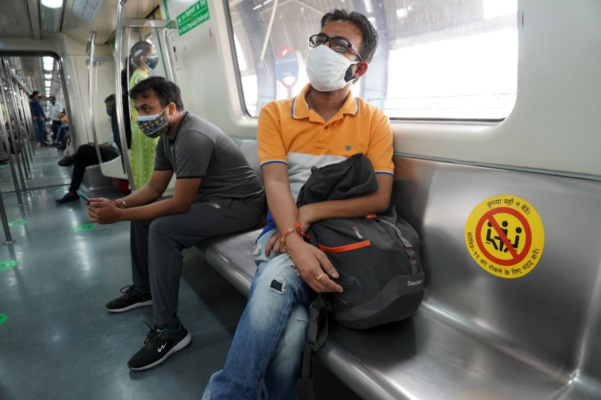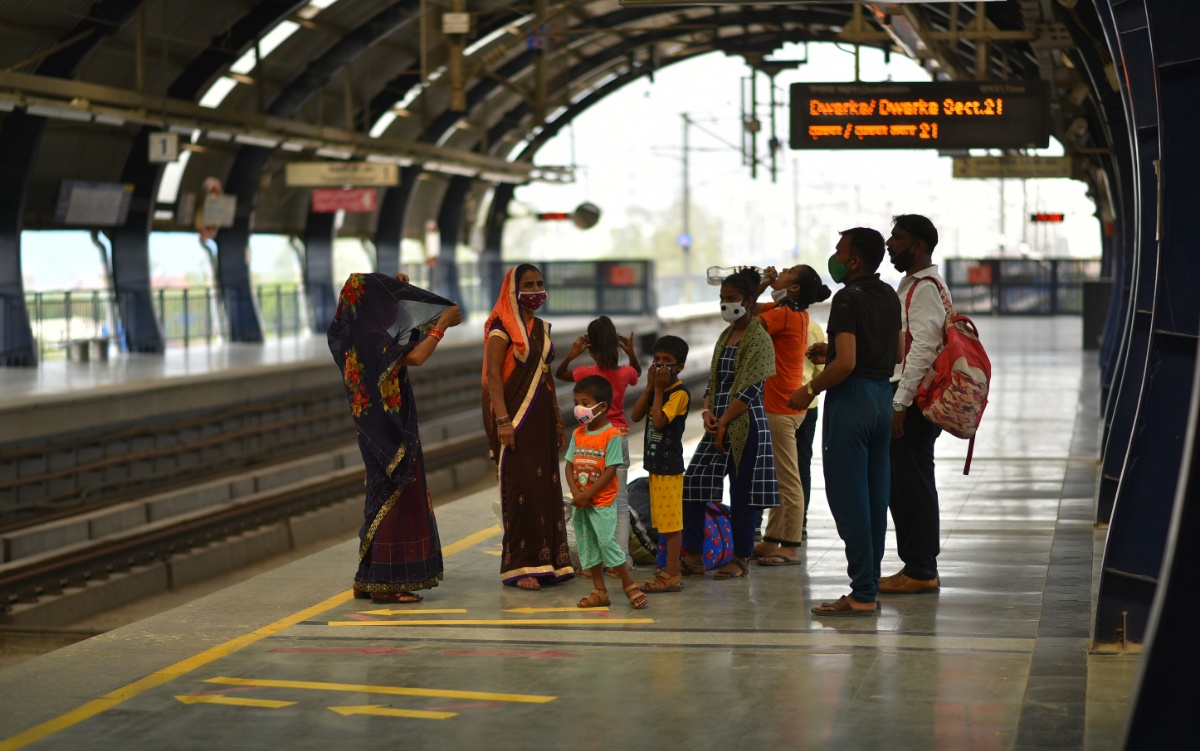 当地时间2021年6月7日,印度新德里,民众搭乘地铁。据报道,印度首都新德里开始继续有限度解除防疫封锁措施,新德里地区的地铁列车获准以50%的载客量恢复运营。