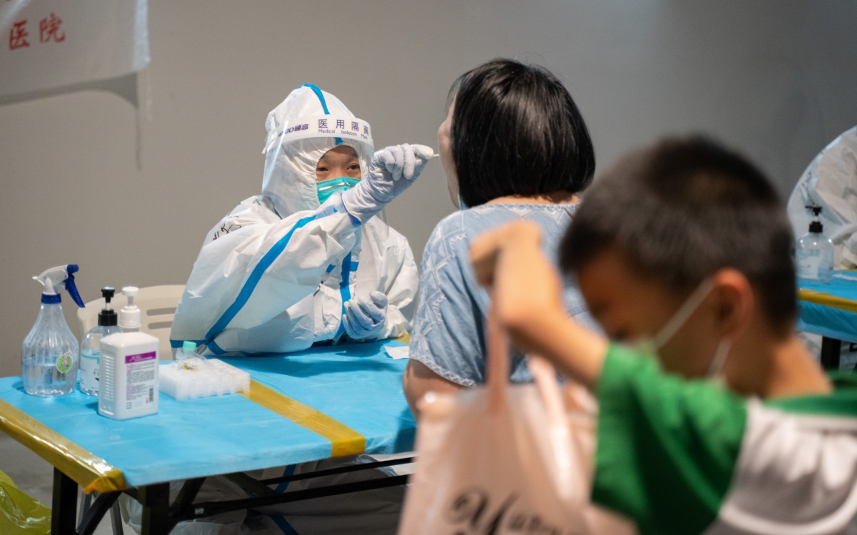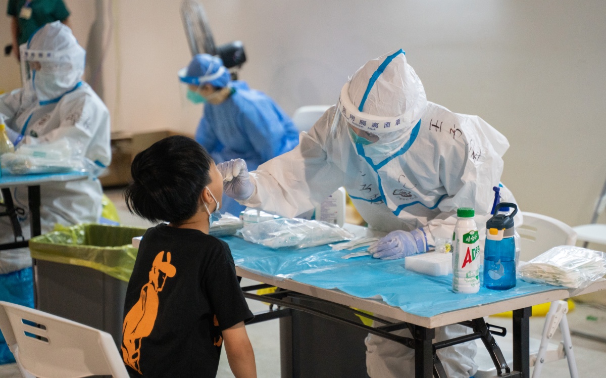 2021年6月8日,广东广州,荔湾区芳村片区进行第四轮核酸检测,图为芳村片区茶滘街道花地湾生活馆检测点核酸检测过程,医护人员正在对小孩进行核酸检测。