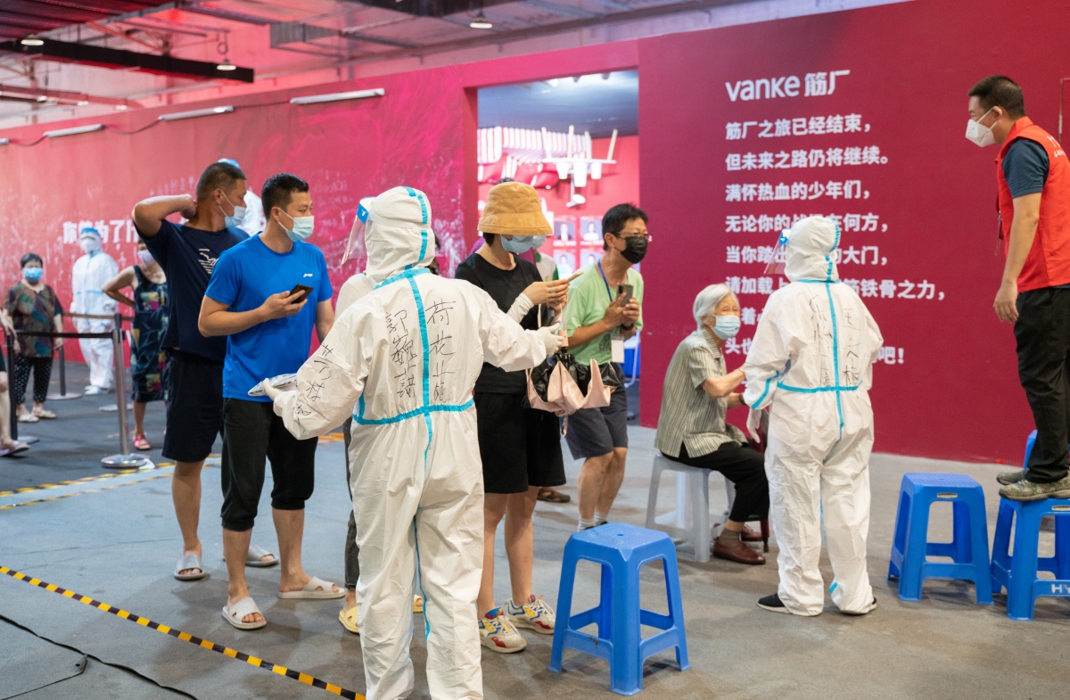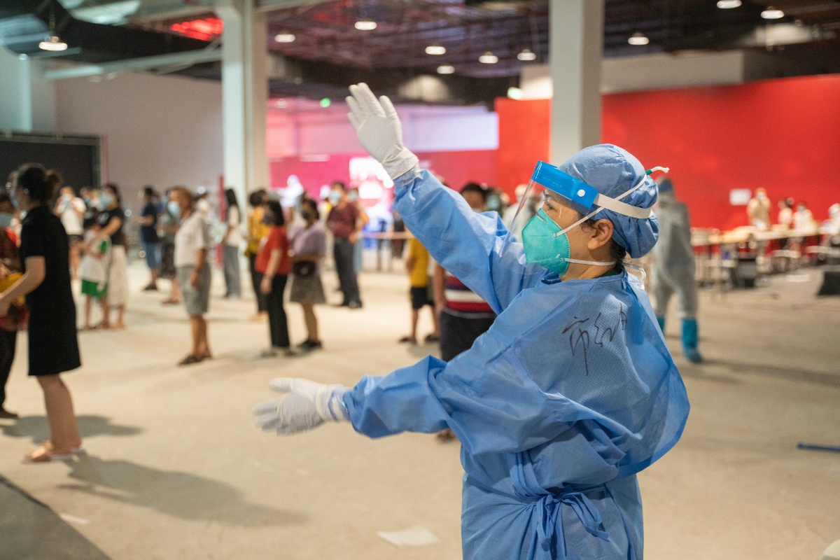 2021年6月8日,广东广州,荔湾区芳村片区进行第四轮核酸检测,图为芳村片区茶滘街道花地湾生活馆检测点核酸检测过程,志愿者和工作人员在准备进场核验信息和核酸检测的群众面前引导和维持秩序。