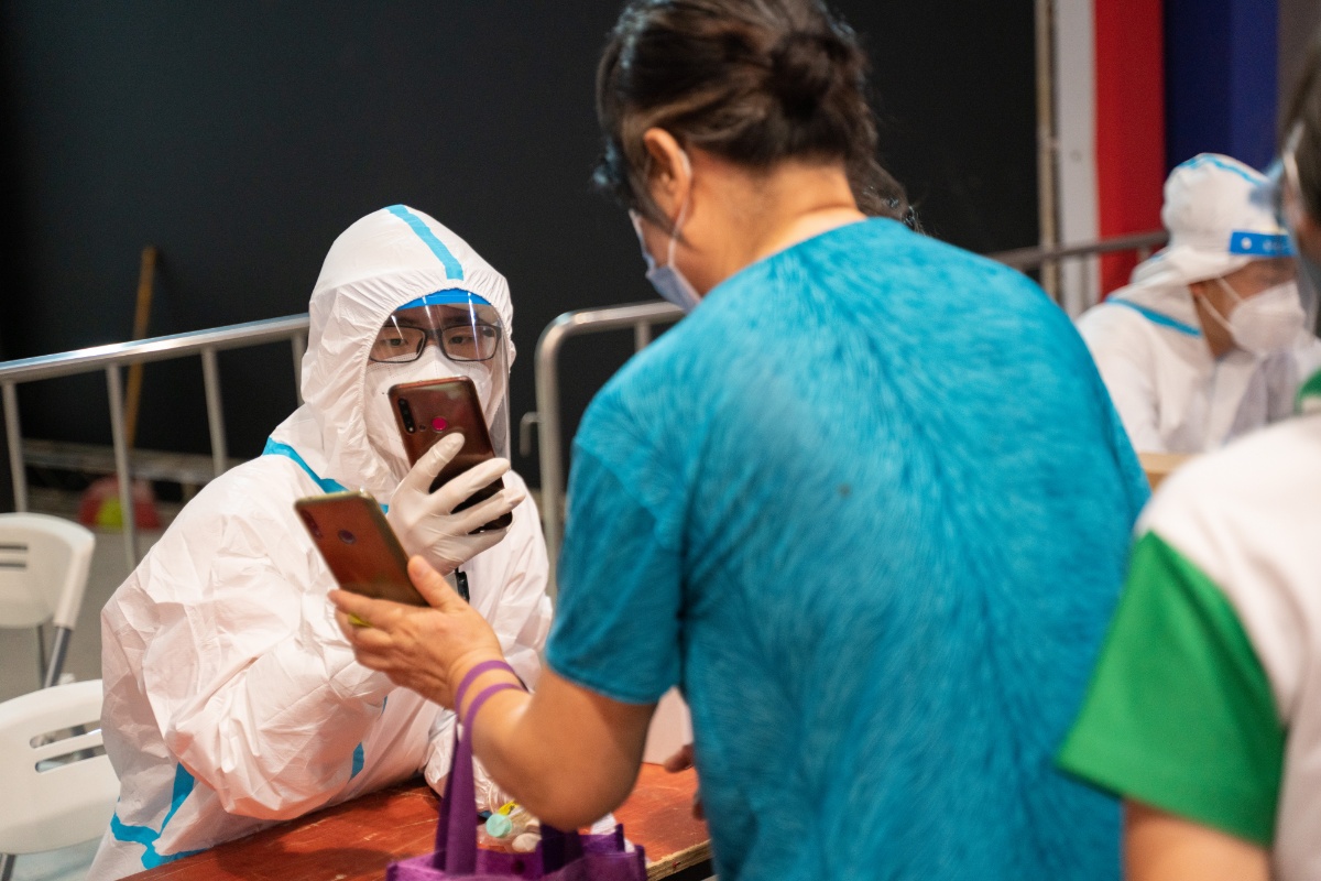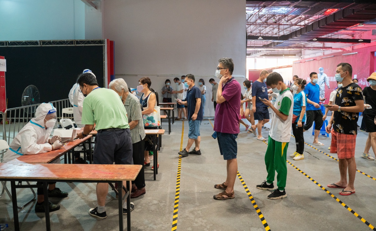 2021年6月8日,广东广州,荔湾区芳村片区进行第四轮核酸检测,图为芳村片区茶滘街道花地湾生活馆检测点核酸检测过程,工作人员正在和群众进行个人信息核验。