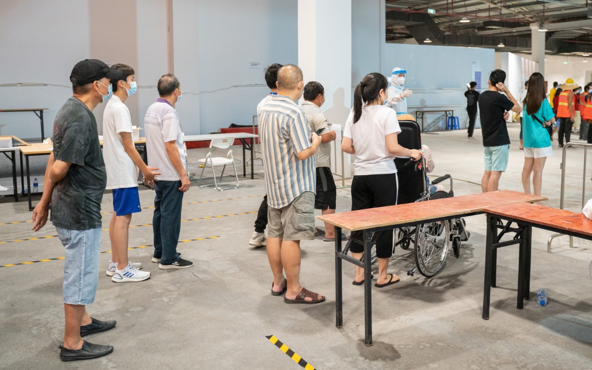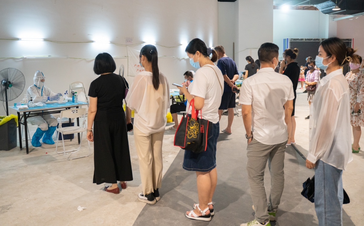 2021年6月8日,广东广州,荔湾区芳村片区进行第四轮核酸检测,图为芳村片区茶滘街道花地湾生活馆检测点核酸检测过程,已核验个人信息分小组排队等候的群众。