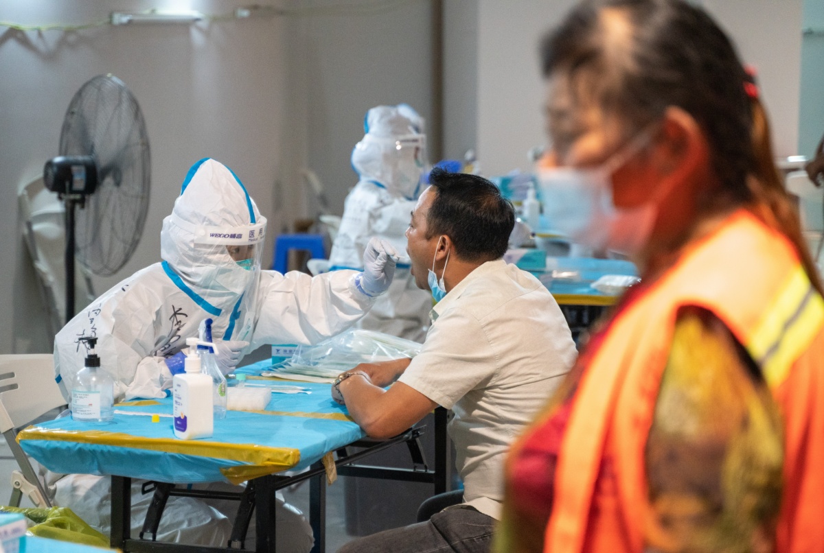 2021年6月8日,广东广州,荔湾区芳村片区进行第四轮核酸检测,图为芳村片区茶滘街道花地湾生活馆检测点核酸检测过程,医护人员正在进行核酸检测。