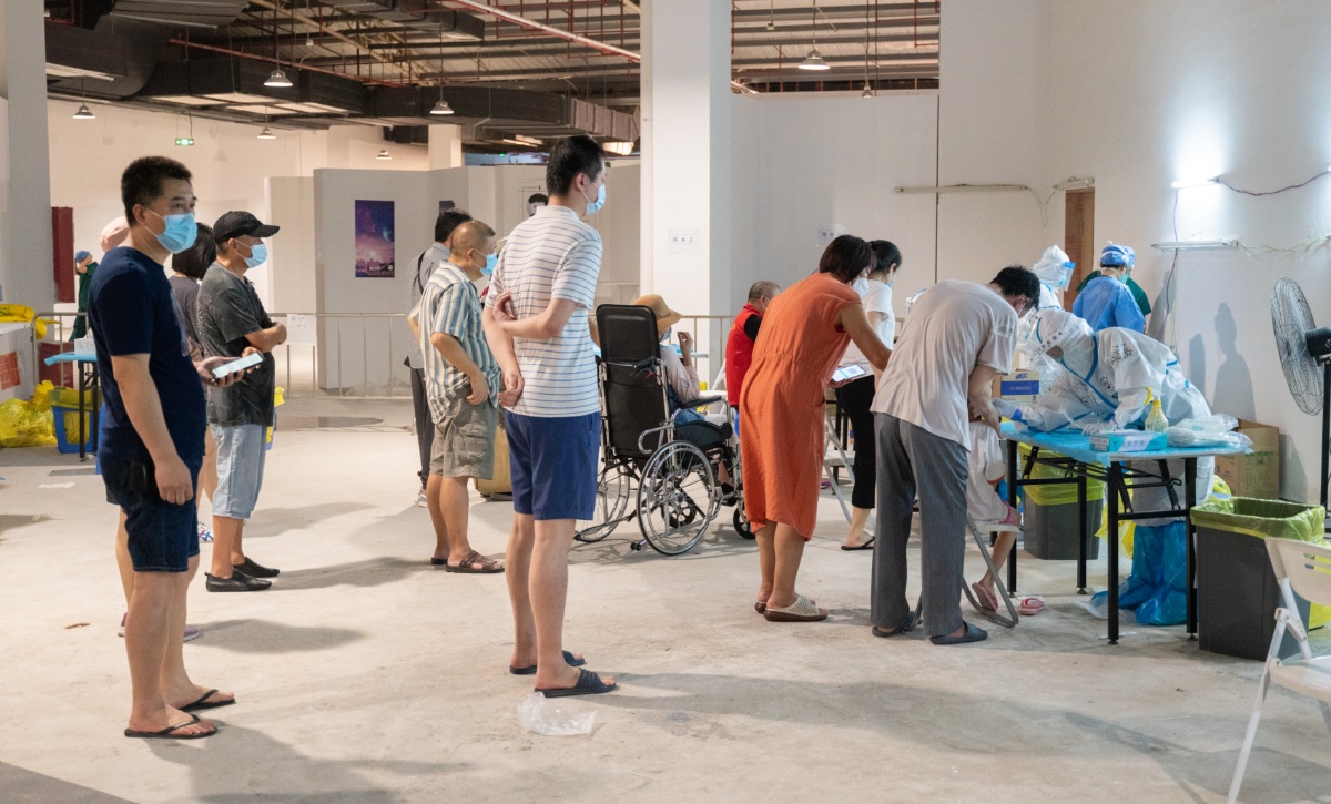 2021年6月8日,广东广州,荔湾区芳村片区进行第四轮核酸检测,图为芳村片区茶滘街道花地湾生活馆检测点核酸检测过程,五人一小组的群众队伍正在进行核酸检测。