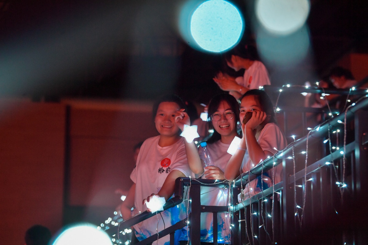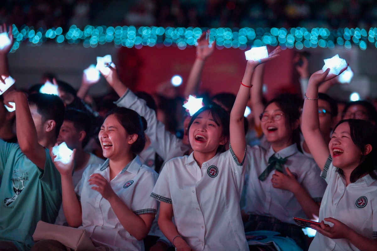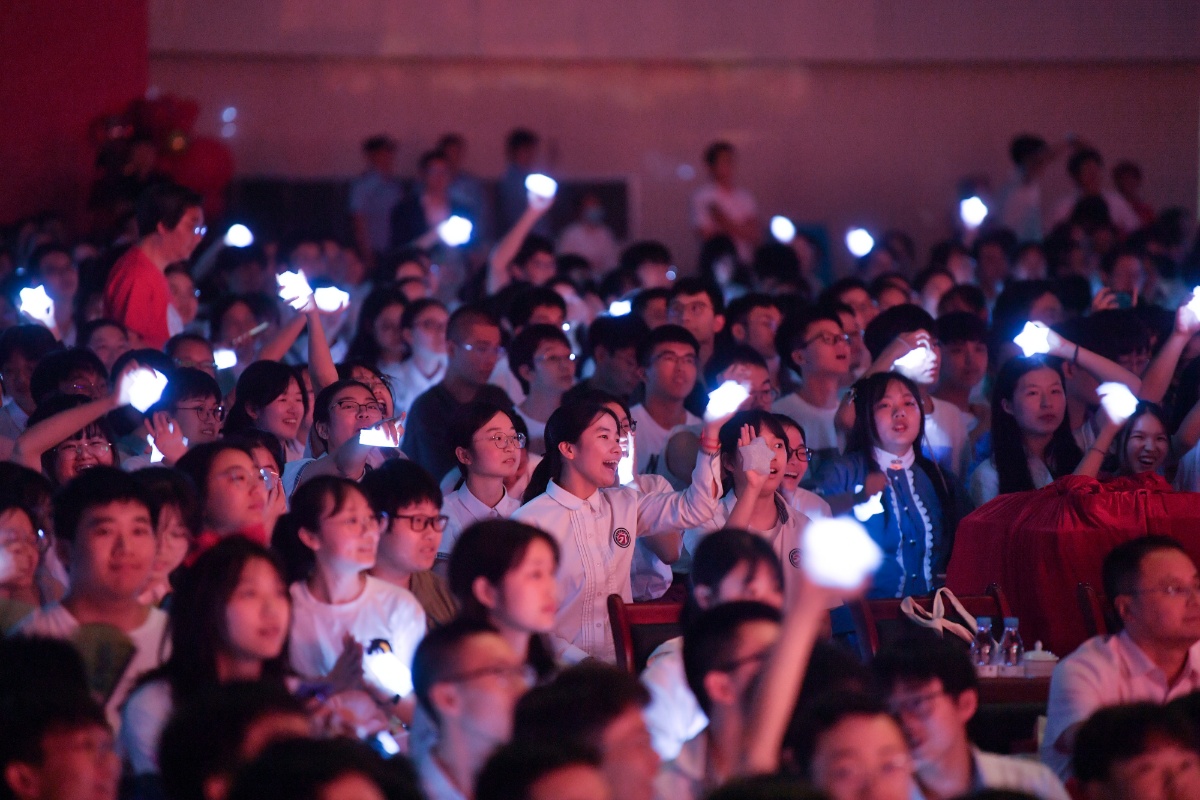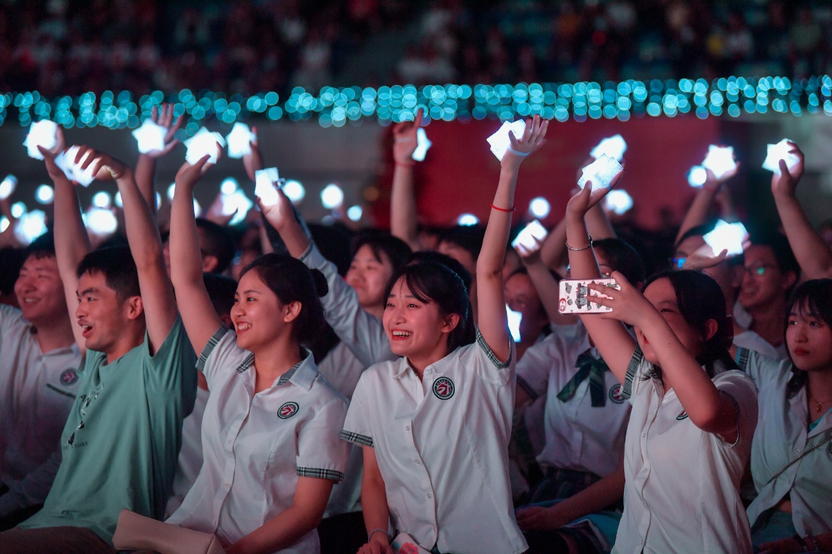 2021年6月9日晚,重庆杨家坪中学举行主题为“骊歌飞扬 一路向党”的盛大毕业典礼,近1400名高三学子度过了一生中最难忘的最后几个小时的中学生活。图为毕业典礼上的同学们。