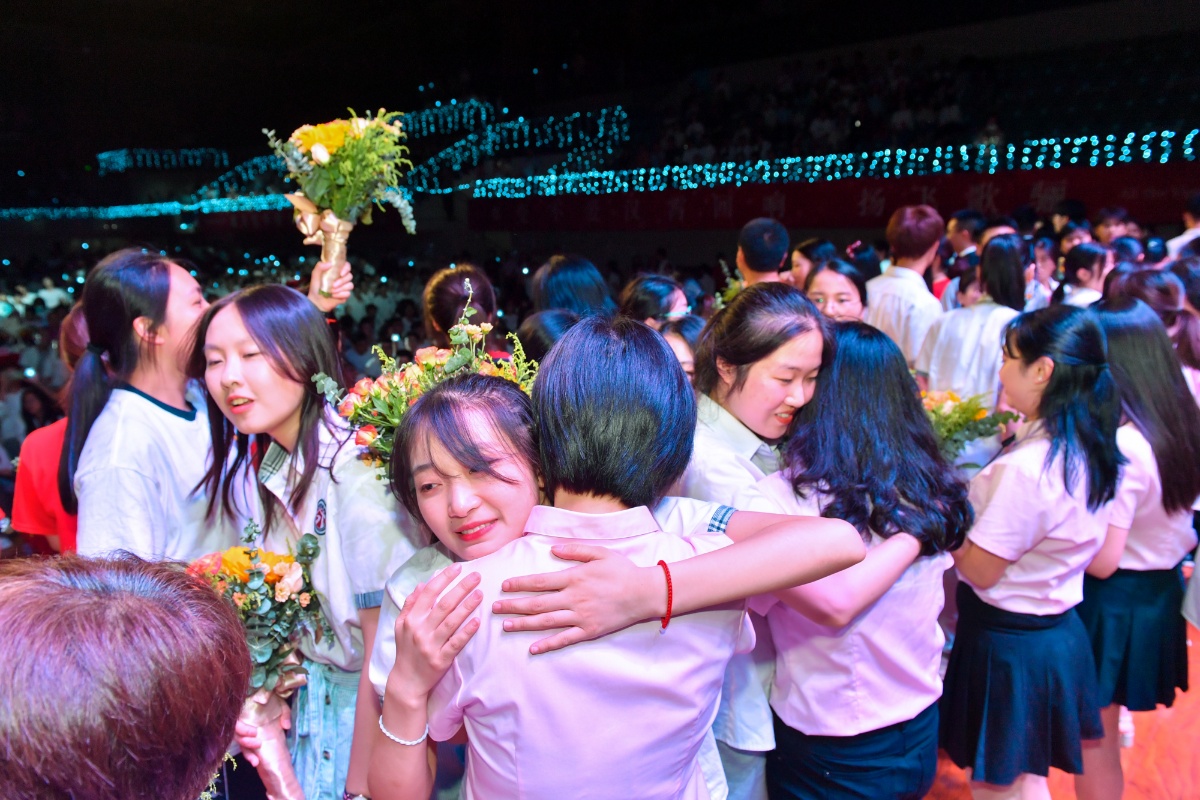 2021年6月9日晚,重庆杨家坪中学举行主题为“骊歌飞扬 一路向党”的盛大毕业典礼,近1400名高三学子度过了一生中最难忘的最后几个小时的中学生活。图为同学们和老师拥抱,激动落泪。