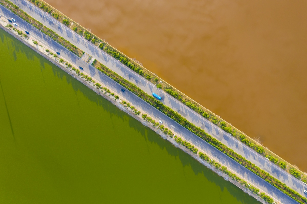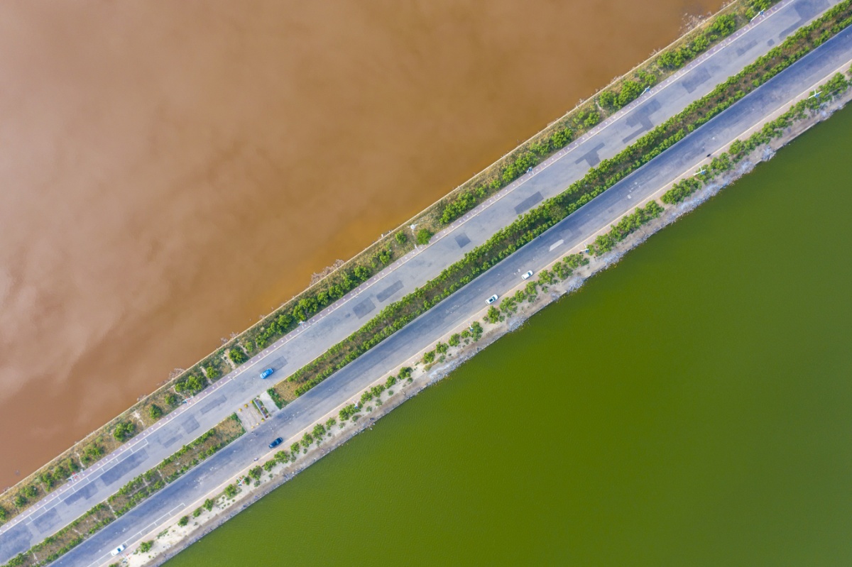 2021年6月23日,山西运城盐湖再现"鸳鸯锅"景观,半红半绿颜色抢眼。近日,随着夏季气温不断升高,山西运城盐湖也呈现出不同的色彩,跨湖大道两侧的湖水水面一侧呈绿色,一侧呈玫瑰红,盐湖再现"鸳鸯锅"景观,半红半绿颜色抢眼。
