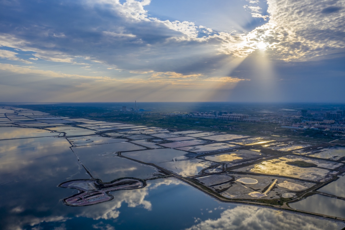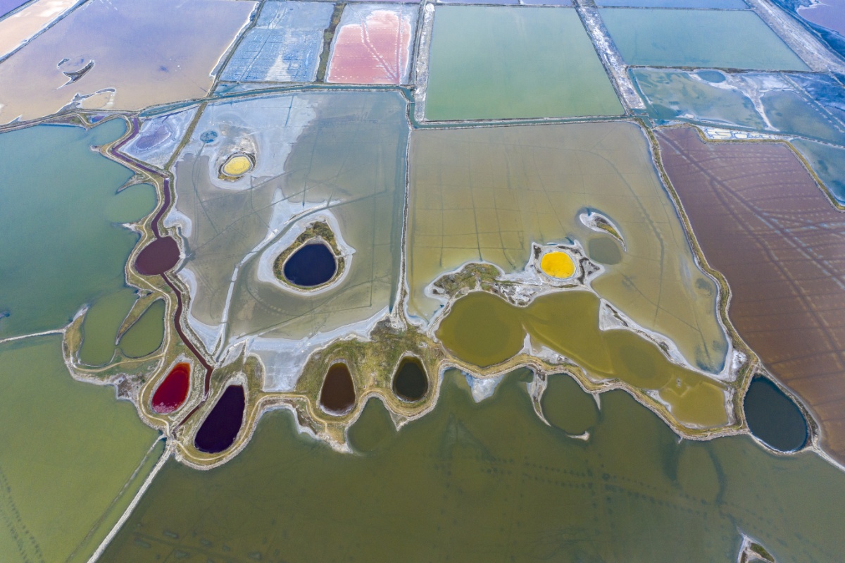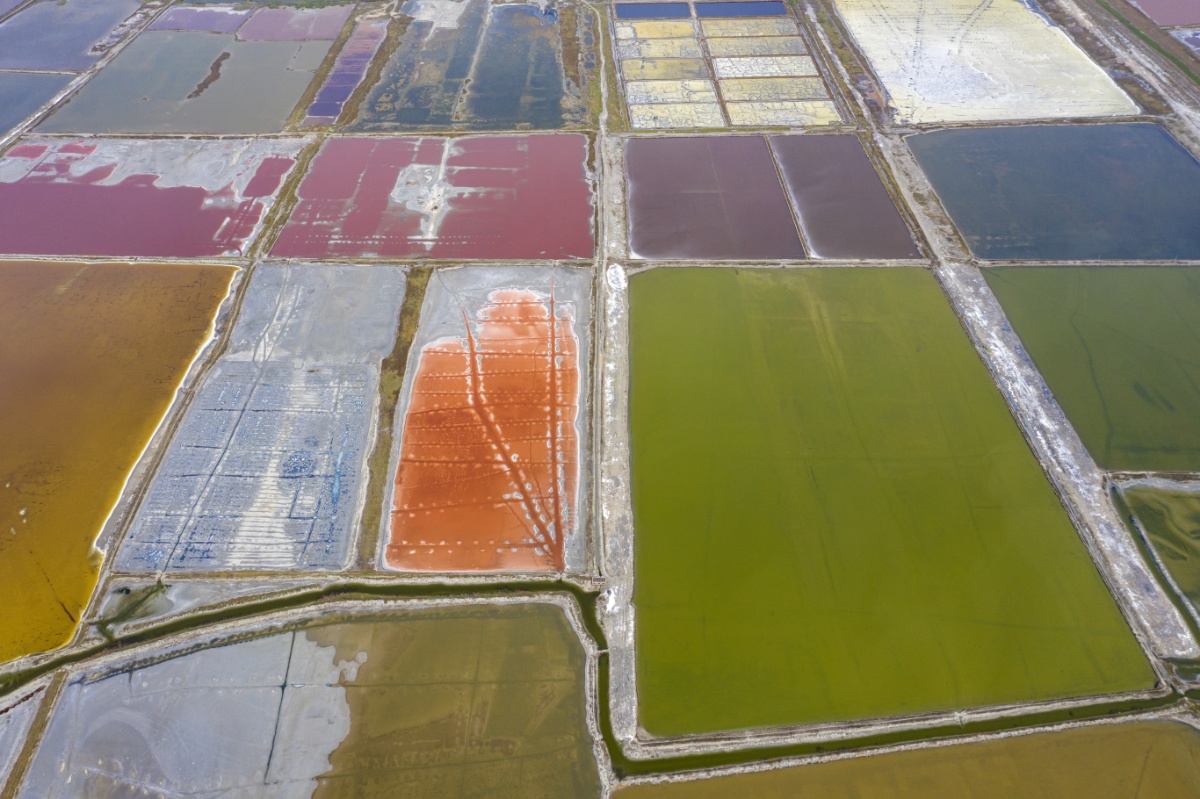 2021年6月23日,山西运城盐湖呈现色彩斑斓的绚丽美景。