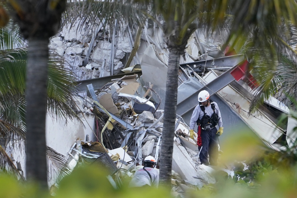 当地时间2021年6月24日,美国佛州迈阿密,美国佛罗里达州迈阿密-戴德县一栋公寓住宅发生部分垮塌。