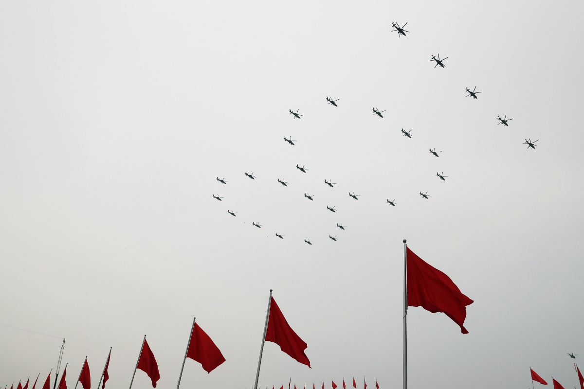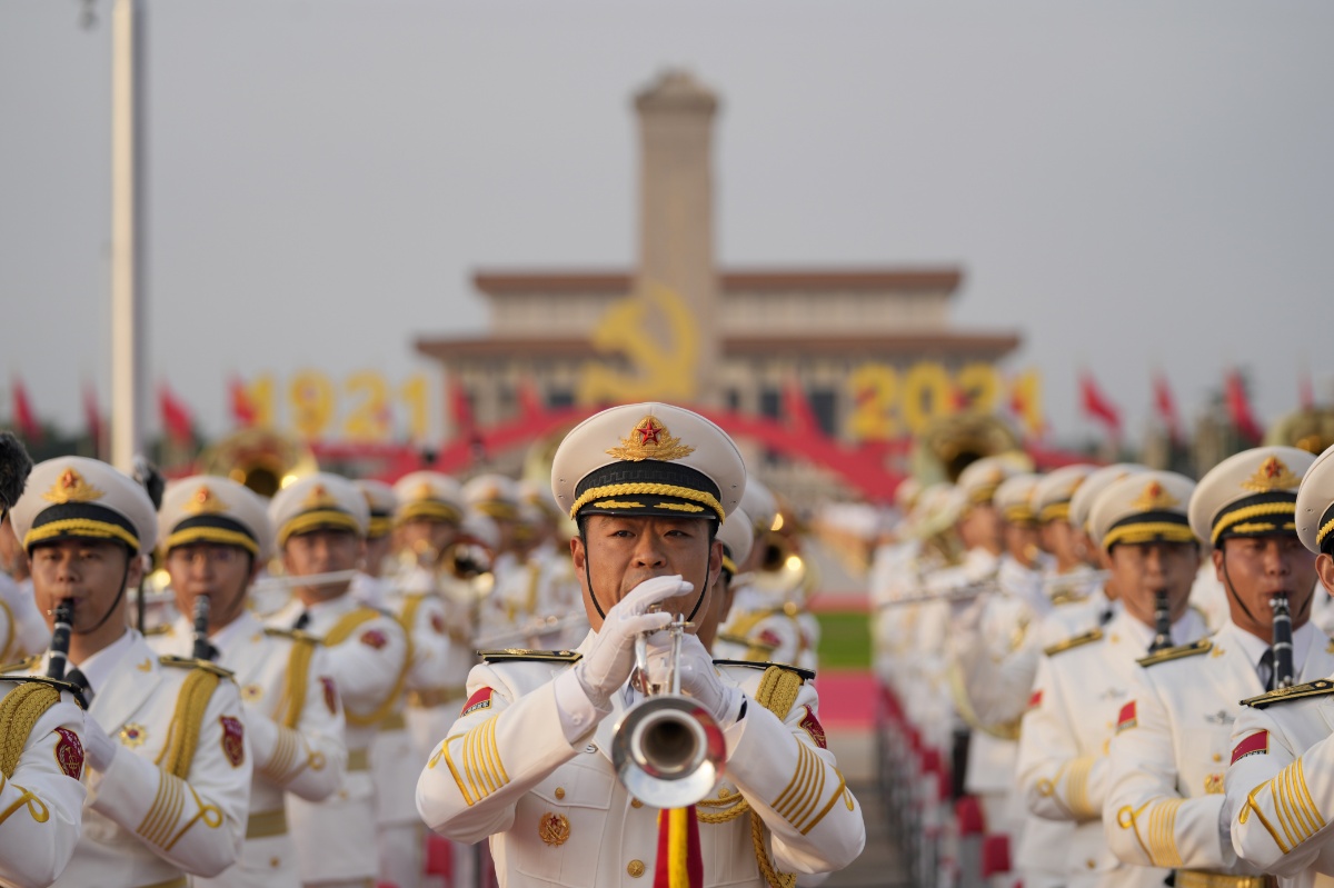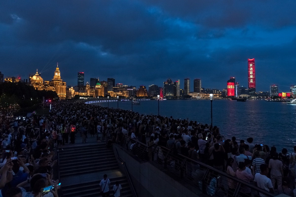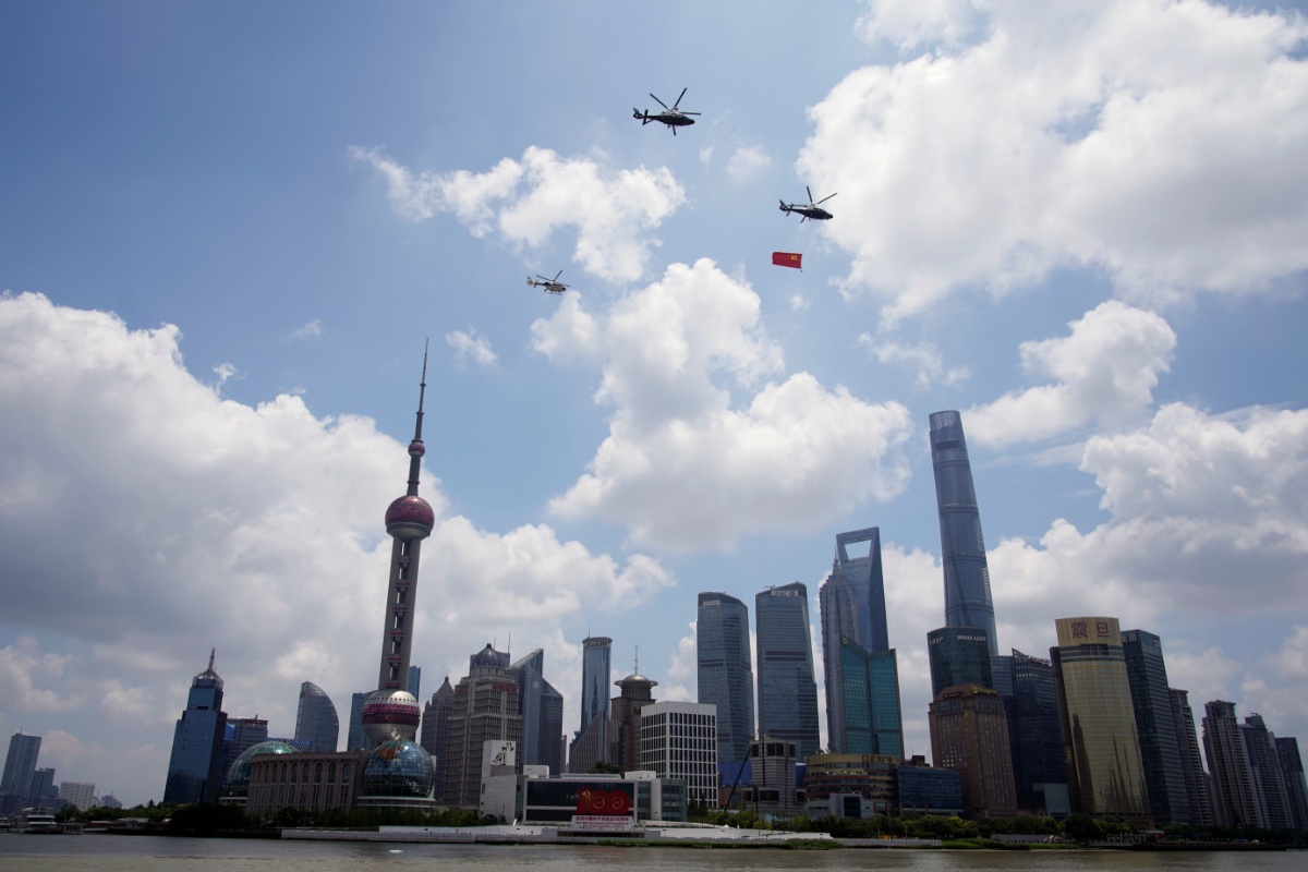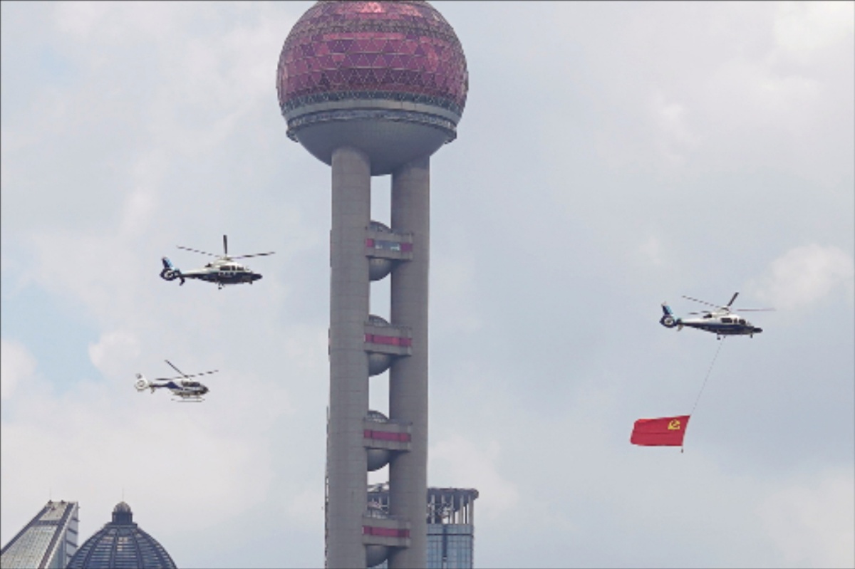2021年7月1日上午,上海,三架警用直升机悬挂党旗,出现在黄浦江上空,吸引了市民和游客驻足仰望,大家为之欢呼雀跃,共同庆祝建党100周年。