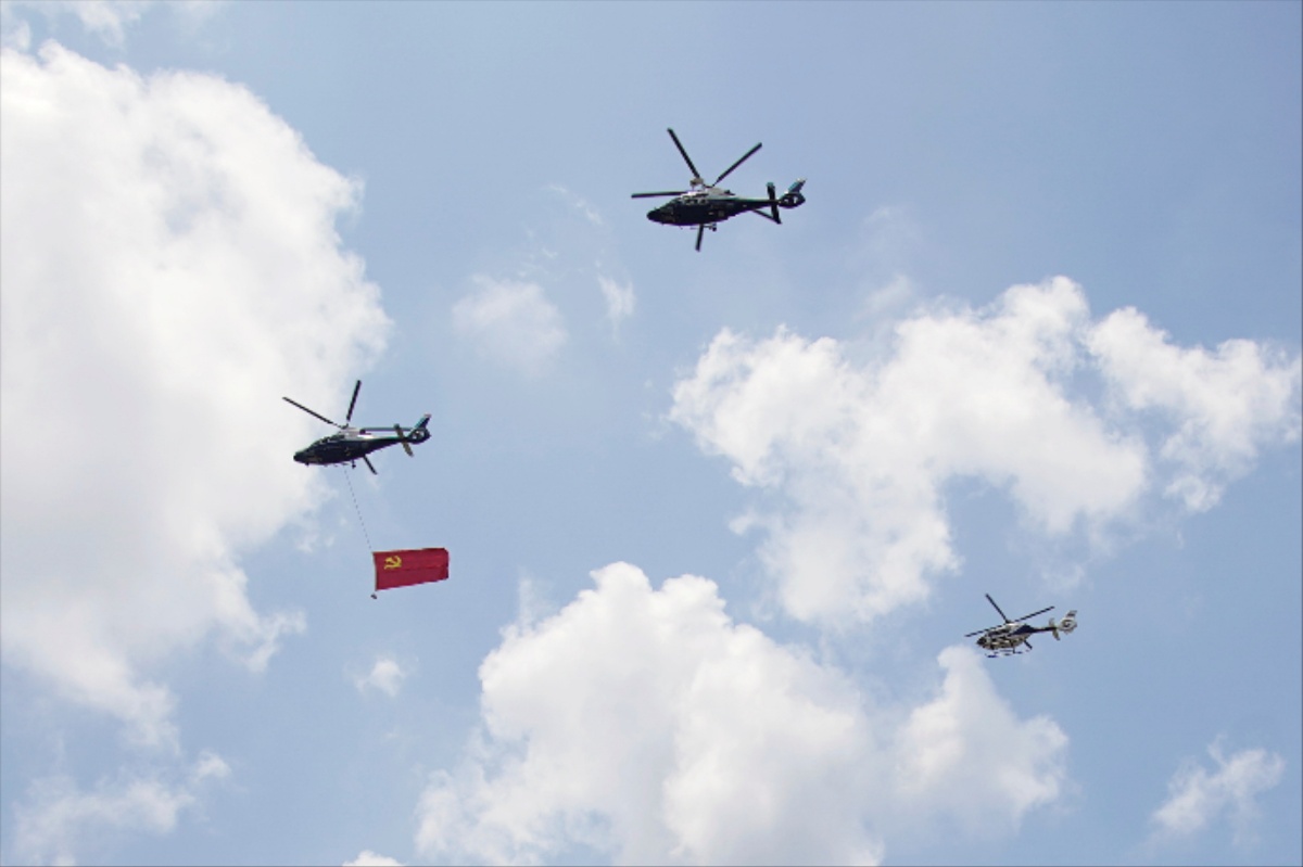 上海公安警用直升机挂党旗巡展 庆祝建党100周年