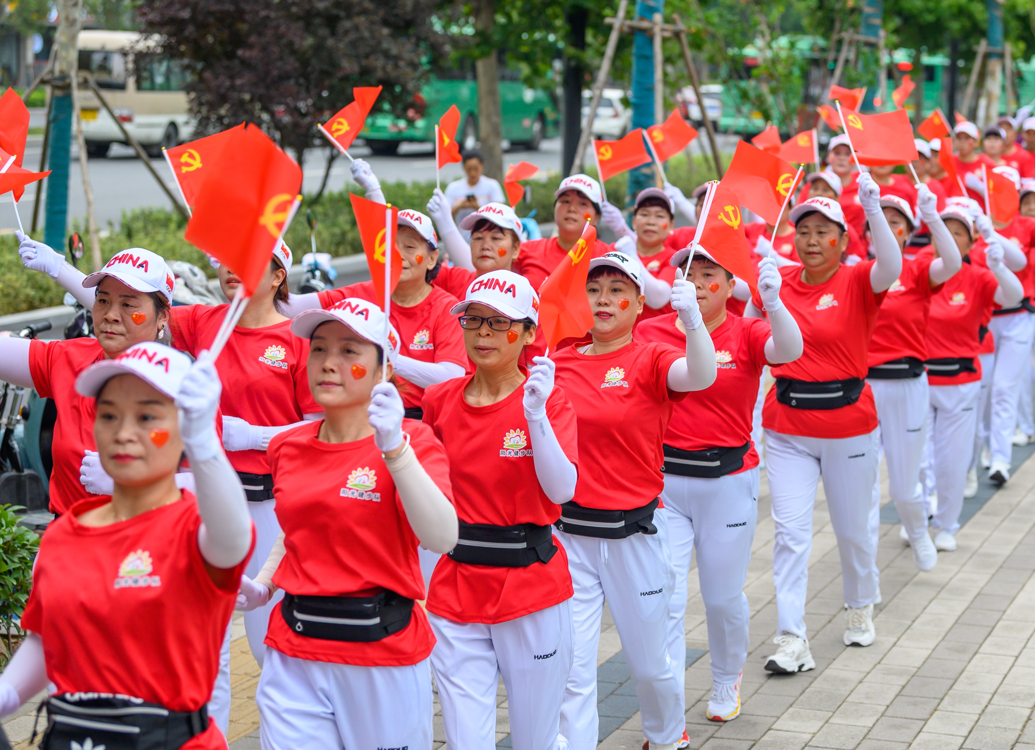 靓丽!郑州市民激情昂扬健步走,身着红衣手举红旗步伐整齐!