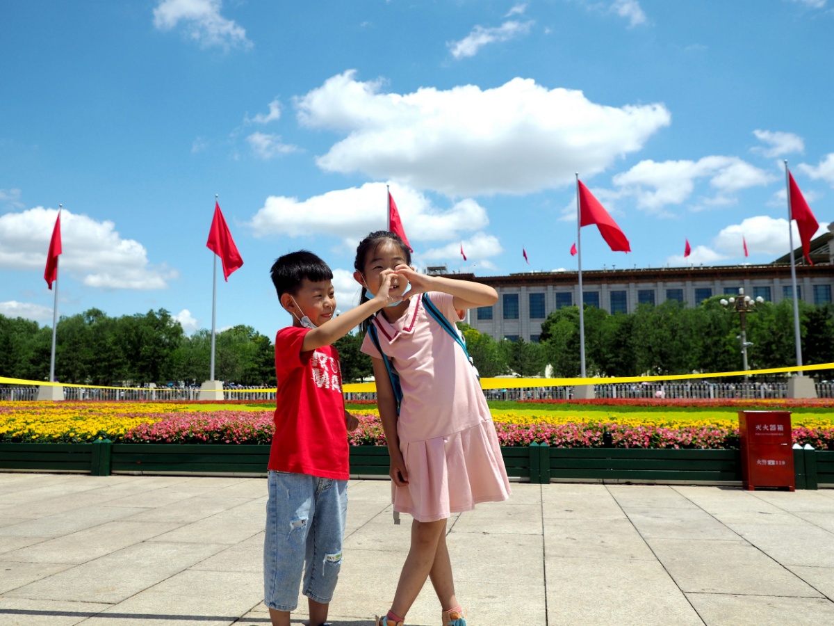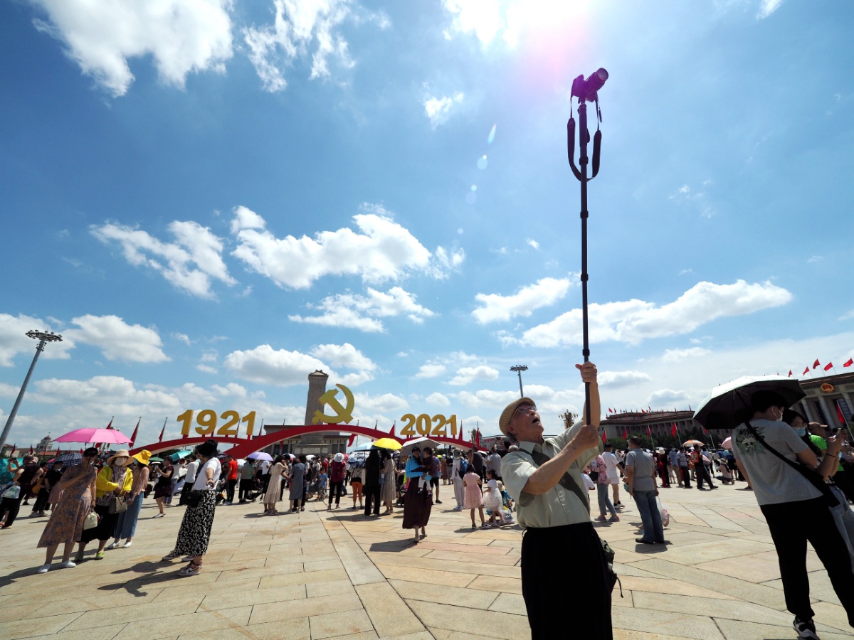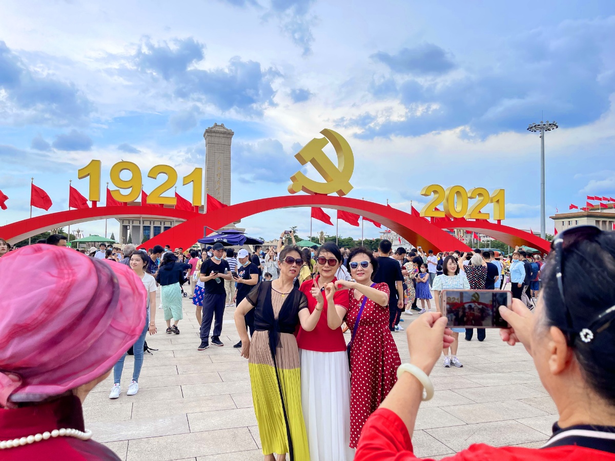 2021年7月3日,游客在天安门广场庆祝建党百年景观前拍照留影。
