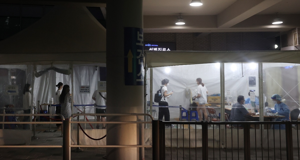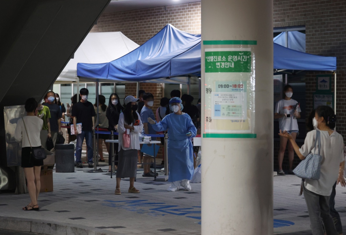 当地时间2021年7月6日,韩国首尔,民众排队等候进行新冠病毒检测。