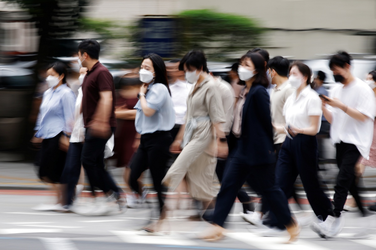 当地时间2021年7月5日,韩国首尔,通勤者戴着口罩在街头行走。