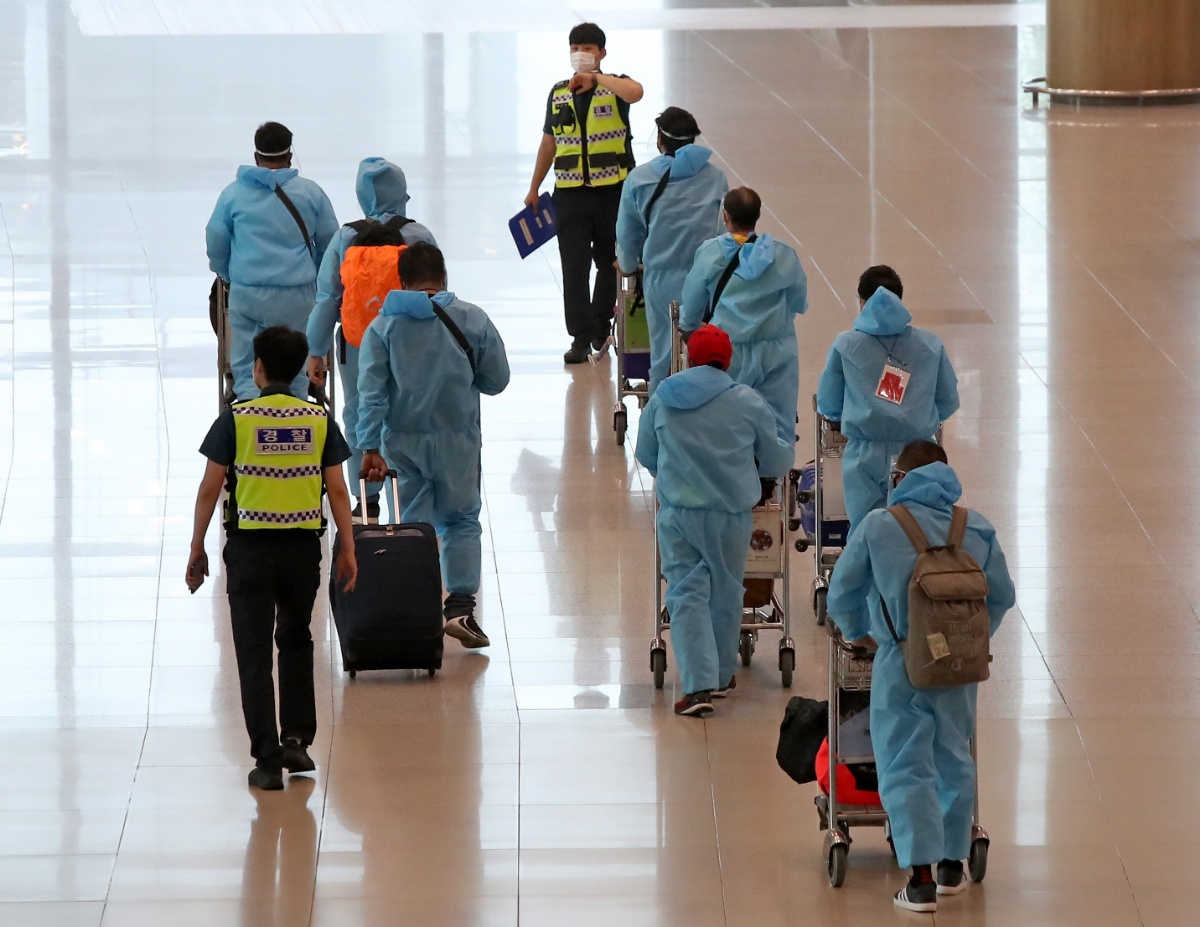 当地时间2021年7月2日,韩国,来自印度的旅客穿着防护服抵达仁川国际机场。