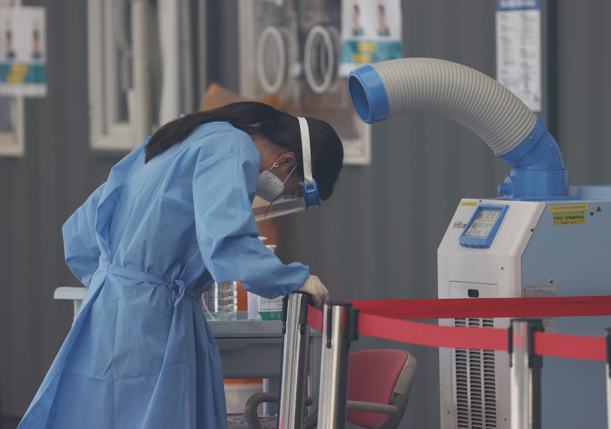 当地时间2021年7月2日,韩国首尔,新冠病毒检测站的一名医护人员。