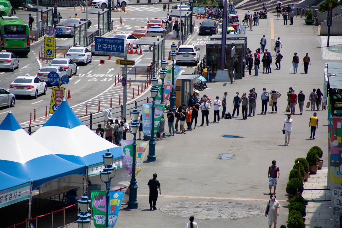 当地时间2021年7月2日,韩国首尔,民众排队进行新冠病毒检测。