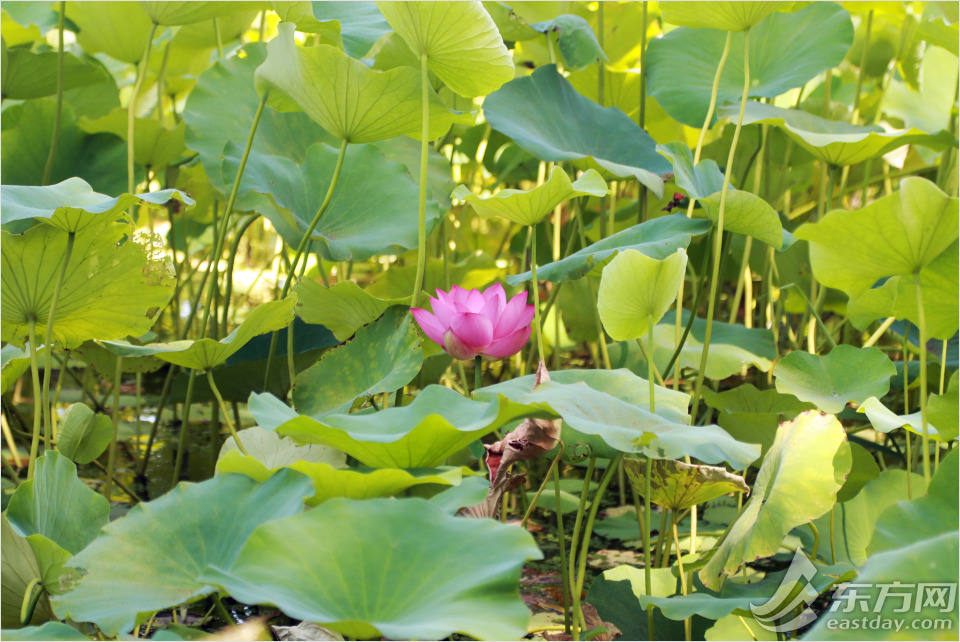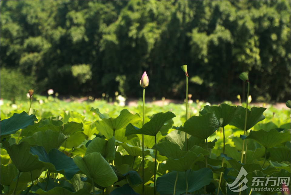 在辰山植物园12000平方米的西湖上,片片荷叶随风浮动。