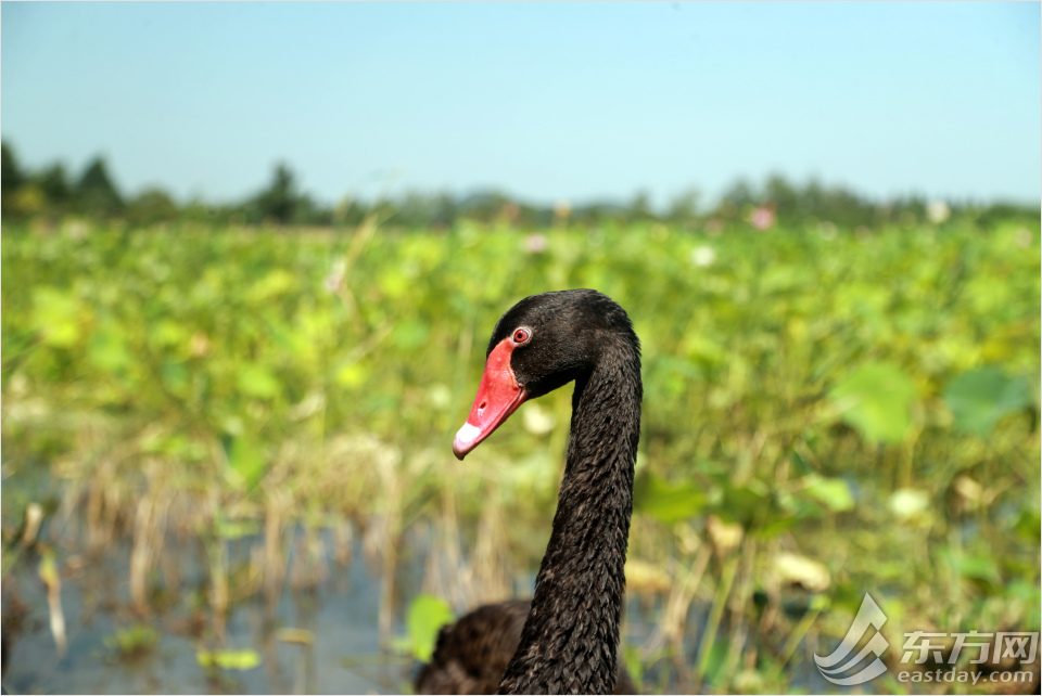 黑天鹅划到辰山植物园西湖边,跟游客一起纳凉、赏花。‘