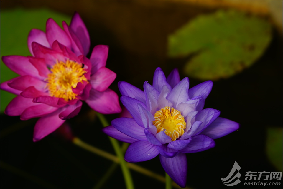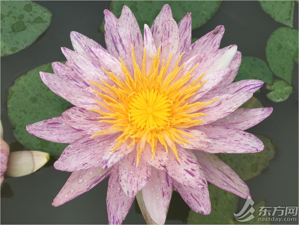 在古猗园不可无竹居北的幽静水域中,56个热带睡莲品种“团聚一堂”。图为’变色紫焰‘,初开是浅浅的紫白色、蓝白色,第二天叶色逐渐变红,而闭合再开的花也变得红艳动人。到了第三天花色又会逐渐加深。如此变幻莫测,真是让每天来欣赏它的人不会感到厌倦。