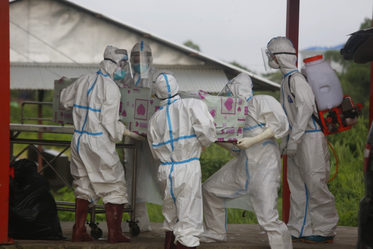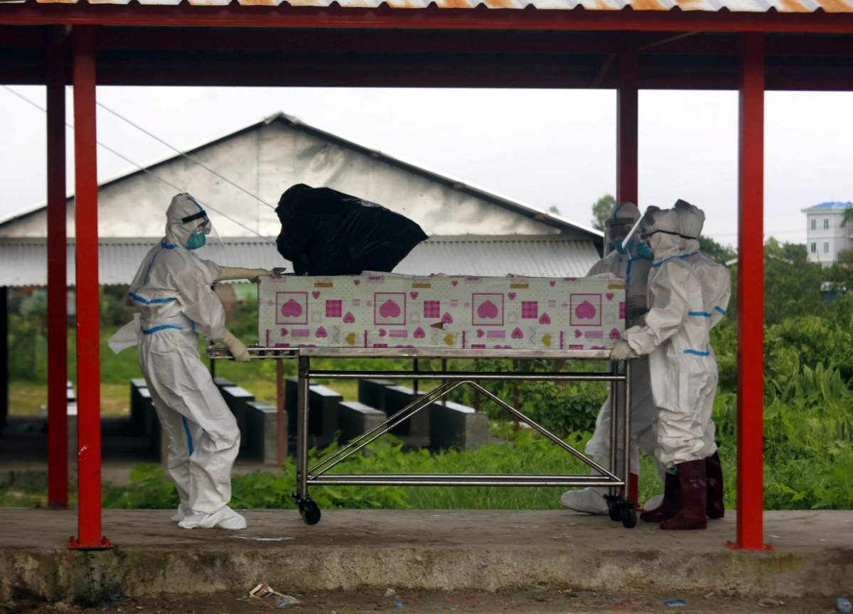 当地时间2021年7月6日,缅甸实兑,志愿者穿着防护服将新冠患者的棺材移至墓地。当地部门称,新冠病毒感染病例在缅甸呈上升趋势。