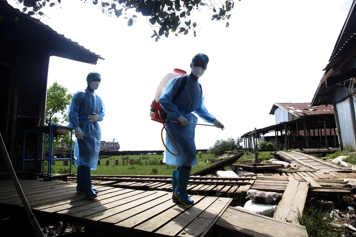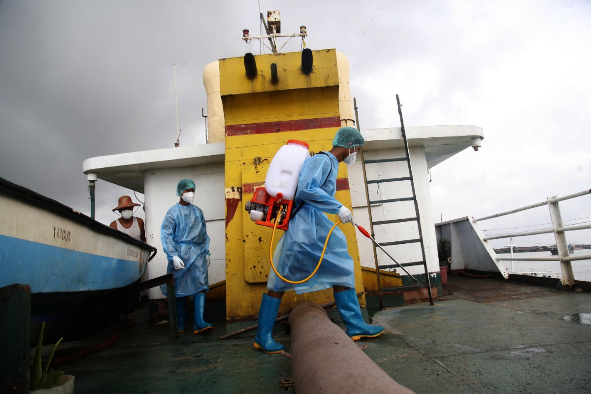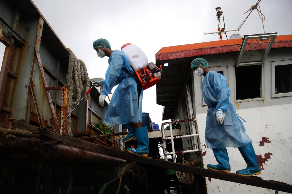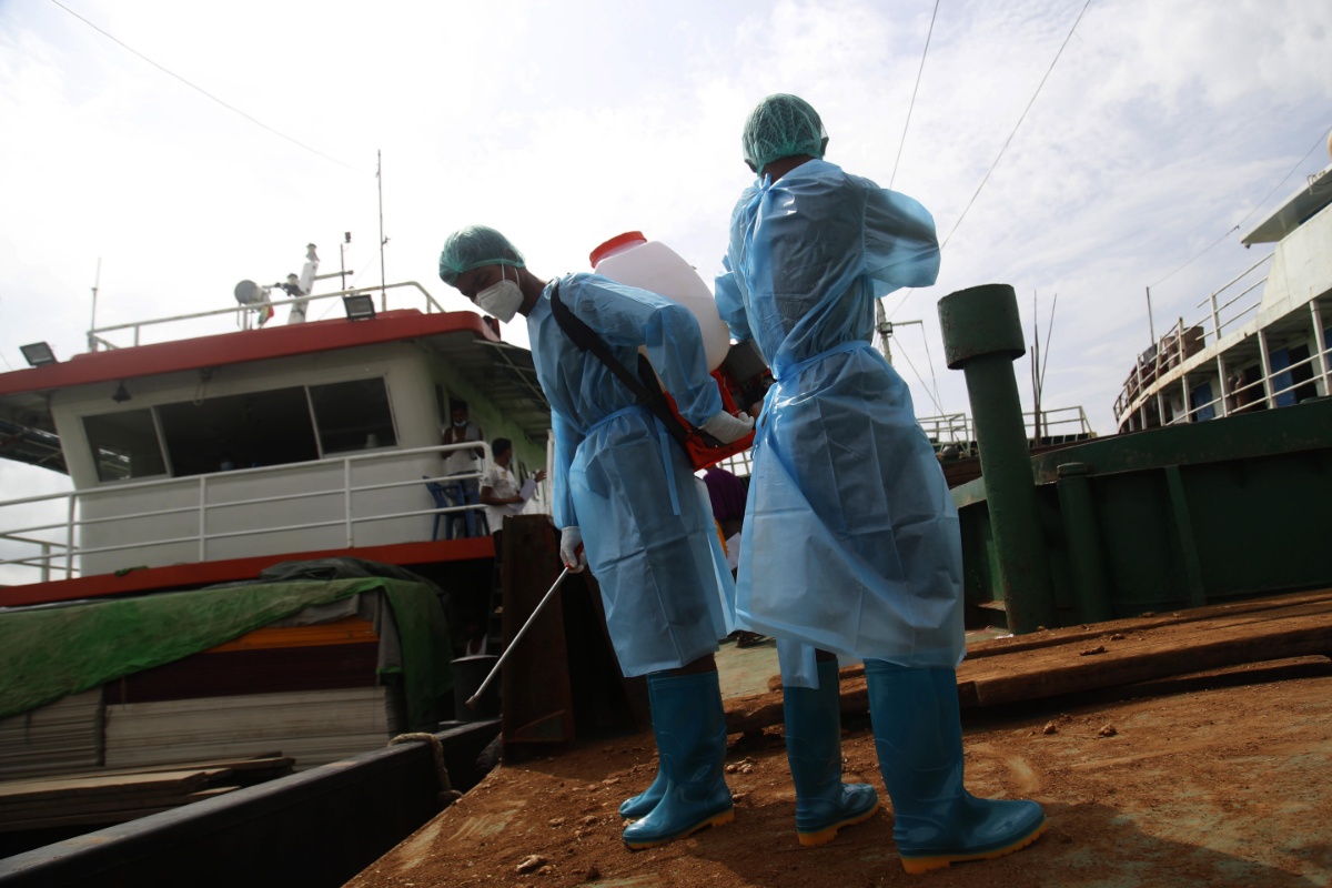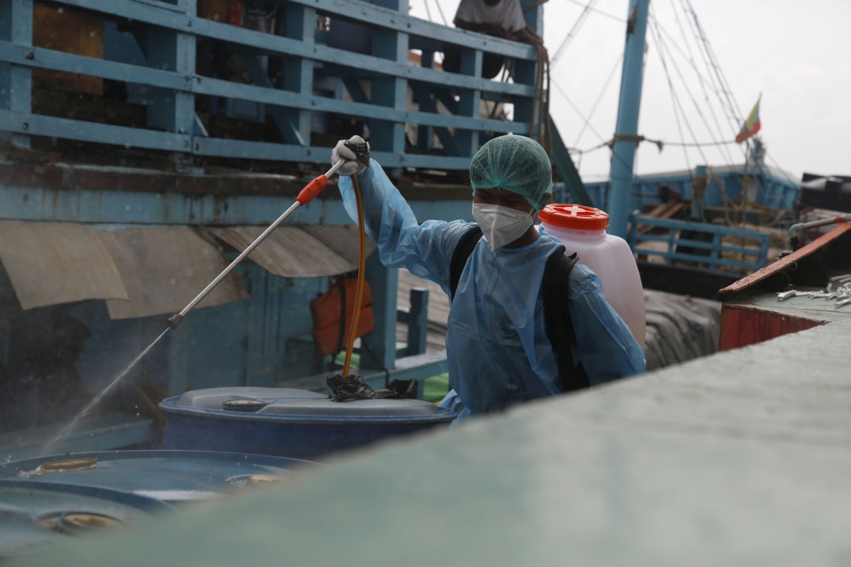 当地时间2021年7月6日,缅甸实兑,两名志愿者正在为货船进行消毒。当地部门称,新冠病毒感染病例在缅甸呈上升趋势。