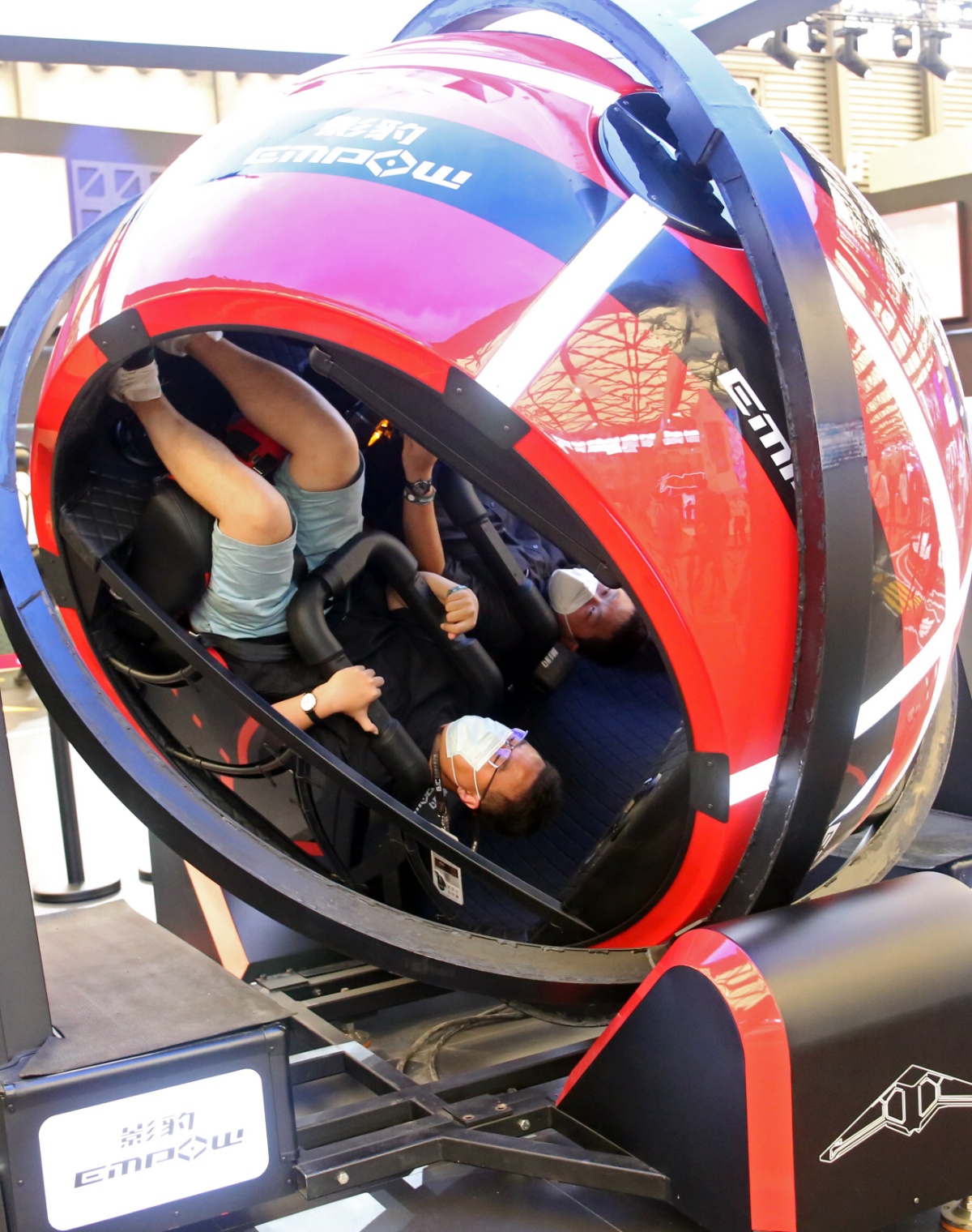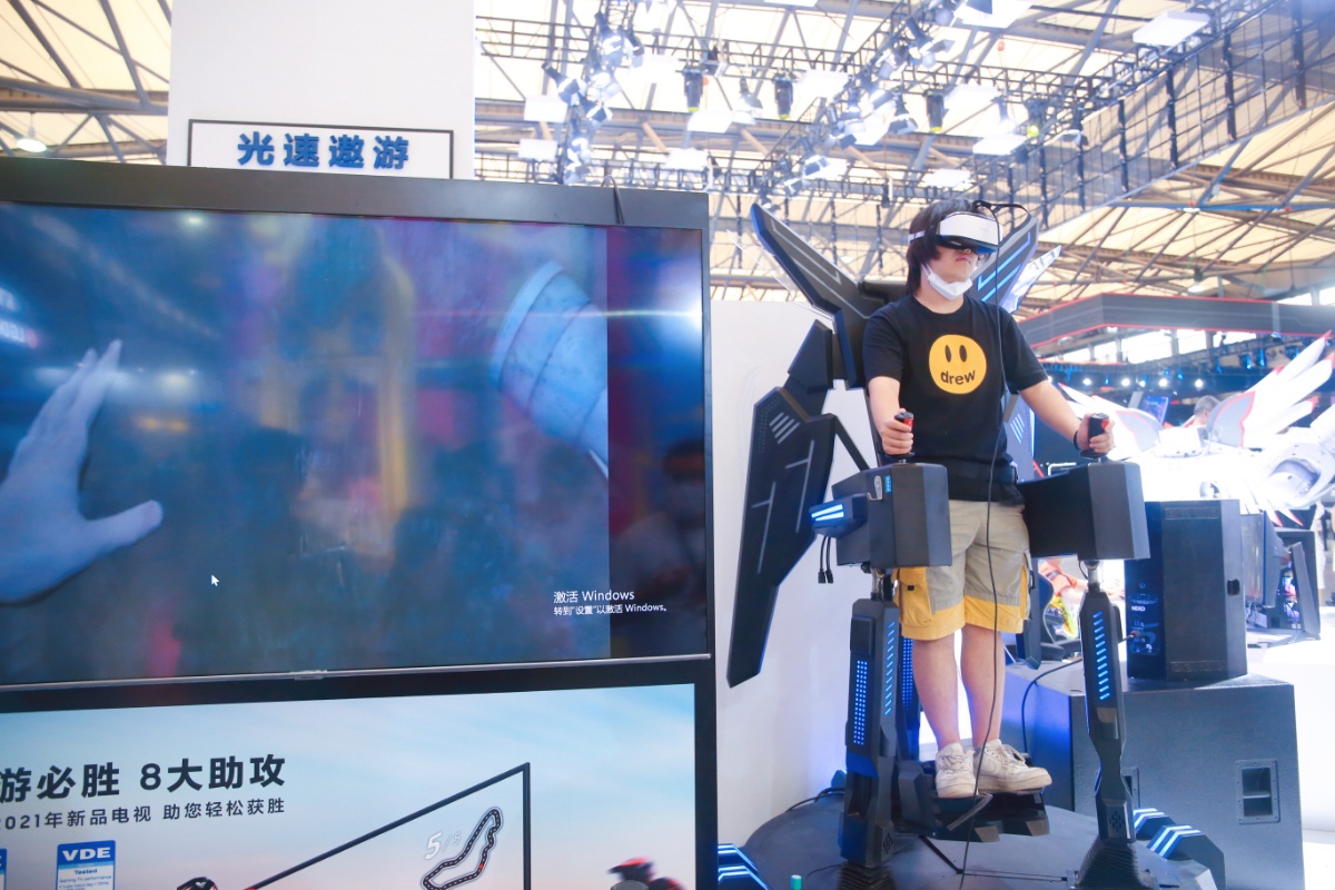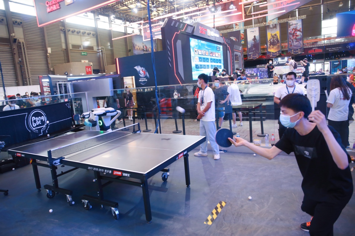 2021年7月30日,上海,ChinaJoy中国国际数码互动娱乐展上除了游戏公司外,还有不少知名硬件厂商如高通骁龙等参展,VR、5G、AI等高科技应用在电竞体感游戏,助推这场暑期二次元盛典的玩家体验。玩家戴上虚拟眼镜操作手柄射击,或是“绑定”各种科幻炫酷的驾驶装备体验虚拟飞车、飞行器、摩托车等体感游戏;知名硬件厂商高通展示了骁龙高性能5G游戏装备请了不少COSPLAY助阵,还特设骁龙AI乒乓电竞房,玩家可以接受庞伯特人工智能乒乓球机器人挑战。