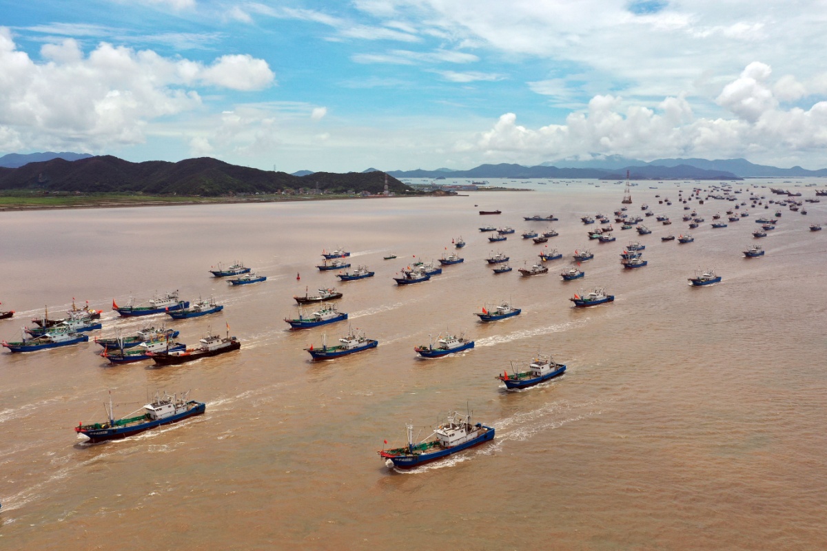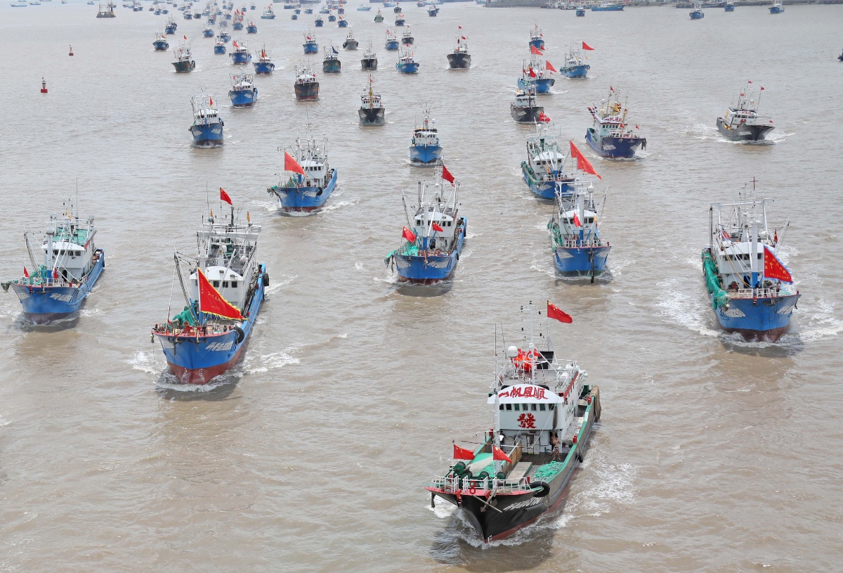 2021年8月1日中午12时,浙江省舟山市大批渔船从沈家门渔港等地开赴禁渔线外的东海海域进行捕捞作业。