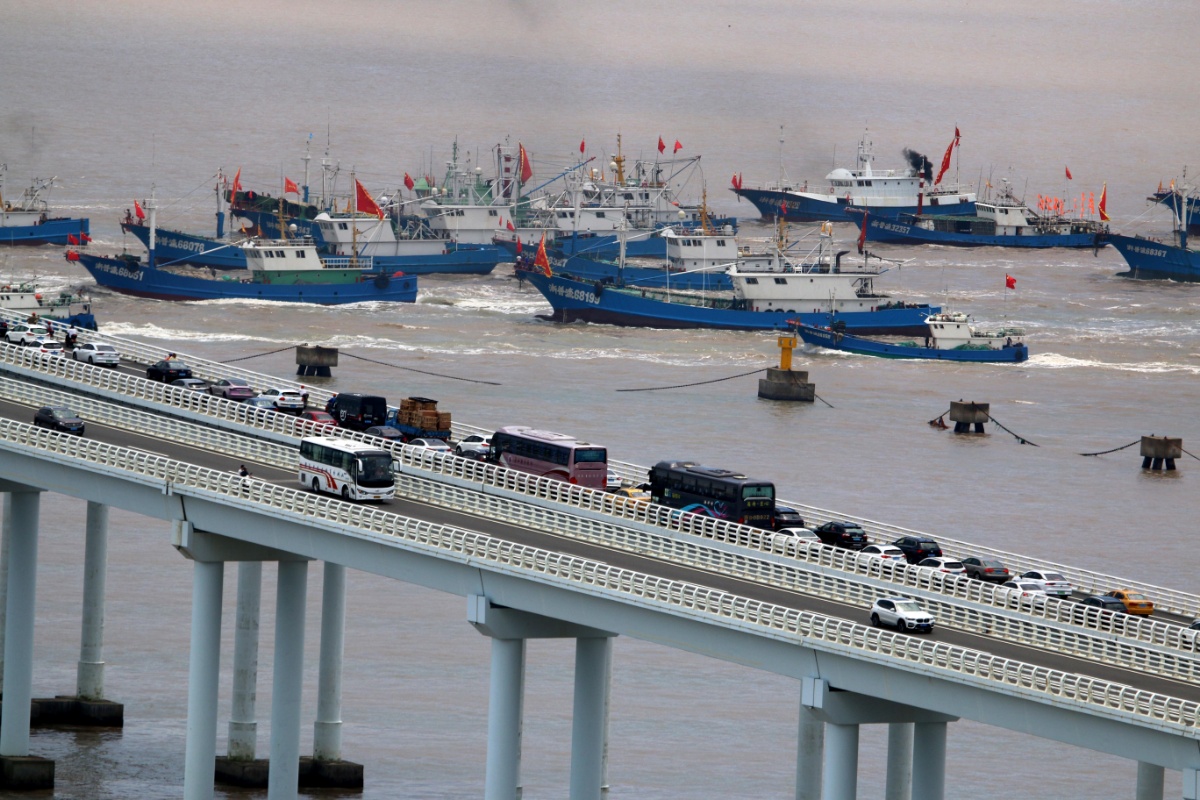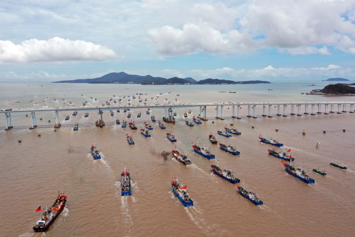 2021年8月1日12时,停泊在浙江省舟山市普陀区沈家门渔港的数千数伏季休渔的渔船扬帆竞发,途经朱家尖大桥海域,驶往东海渔场作业。