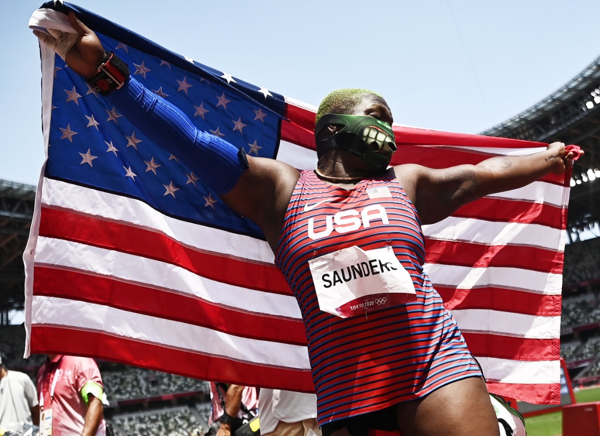 当地时间2021年8月1日,日本东京,2020东京奥运会田径女子铅球决赛,桑德斯“魔鬼”口罩造型吸睛。