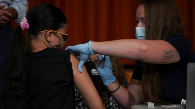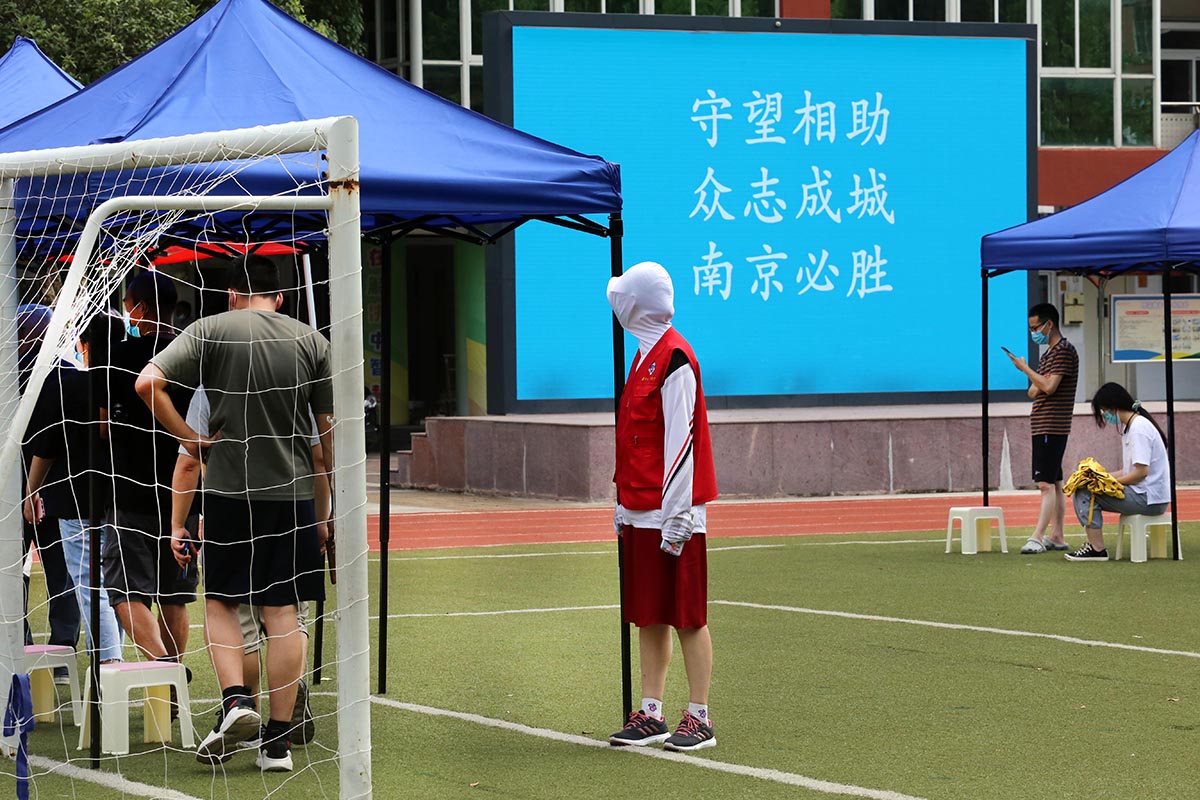 2021年8月2日,江苏省南京市雨花台区一检测点,居民接受核酸检测。