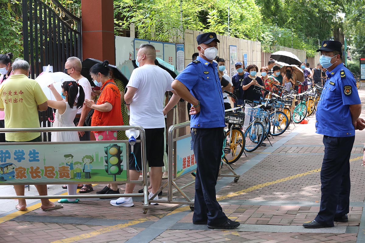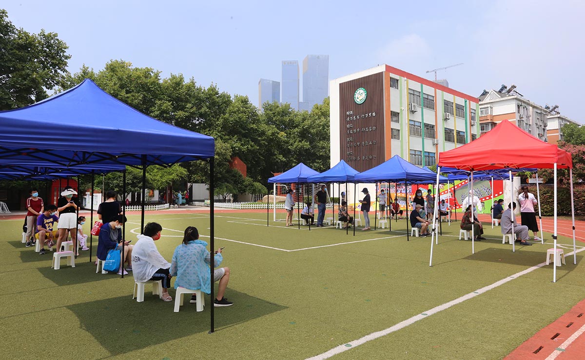 2021年8月2日,南京南湖一小校园内的莫愁街道检测点内,众多市民在工作人员和志愿者的组织和帮助下,在学校操场上间隔一米有序排队,分十人一组进入检测。