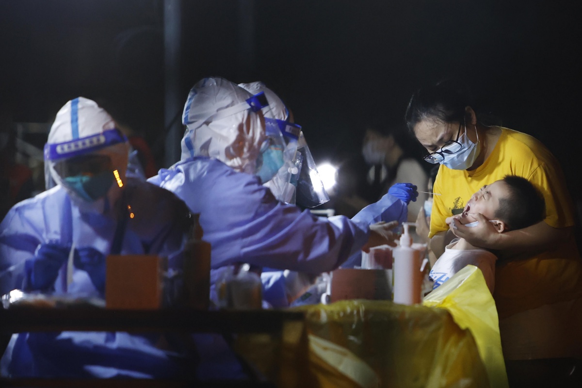 2021年8月2日,上海,位于上海市浦东新区华夏二路1500弄心圆西苑小区内,孩子在家长的陪伴下等待核酸采样。据上海发布消息,8月2日,上海市浦东一医疗机构报告,发现浦东机场货运区一名外航货机服务人员新冠病毒核酸检测阳性。接报后,疾控机构立即对相关人员及场所开展排查处置、流调采样,并进行实验室检测复核。后续情况将及时向社会公布。