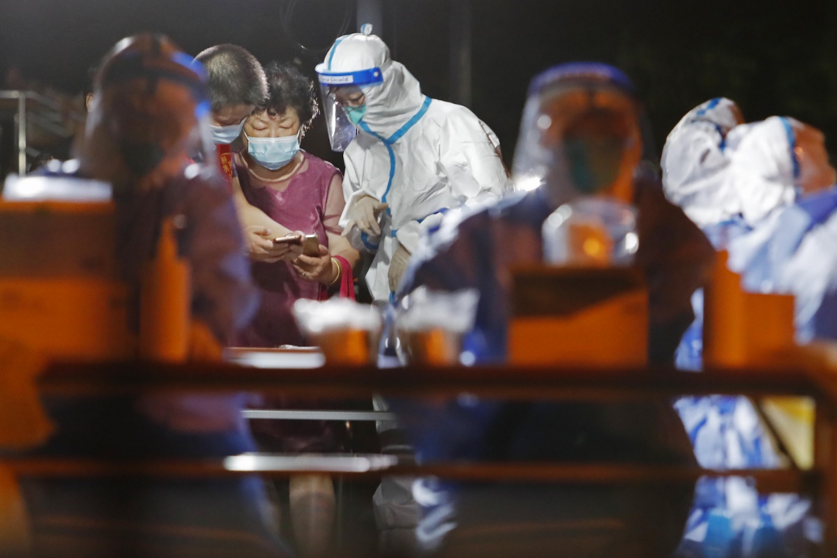 2021年8月2日,上海,位于上海市浦东新区华夏二路1500弄心圆西苑小区内,医护人员正帮助市民进行核酸检测前的个人信息登记。据上海发布消息,8月2日,上海市浦东一医疗机构报告,发现浦东机场货运区一名外航货机服务人员新冠病毒核酸检测阳性。接报后,疾控机构立即对相关人员及场所开展排查处置、流调采样,并进行实验室检测复核。后续情况将及时向社会公布。