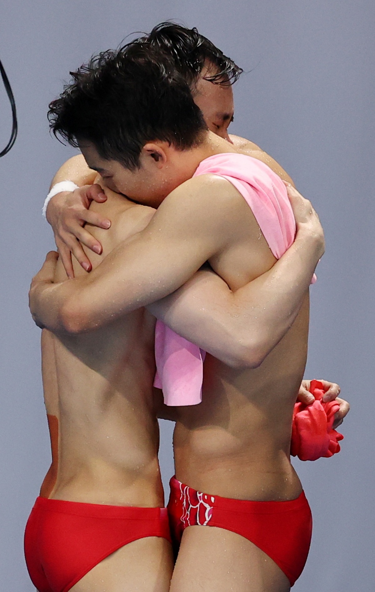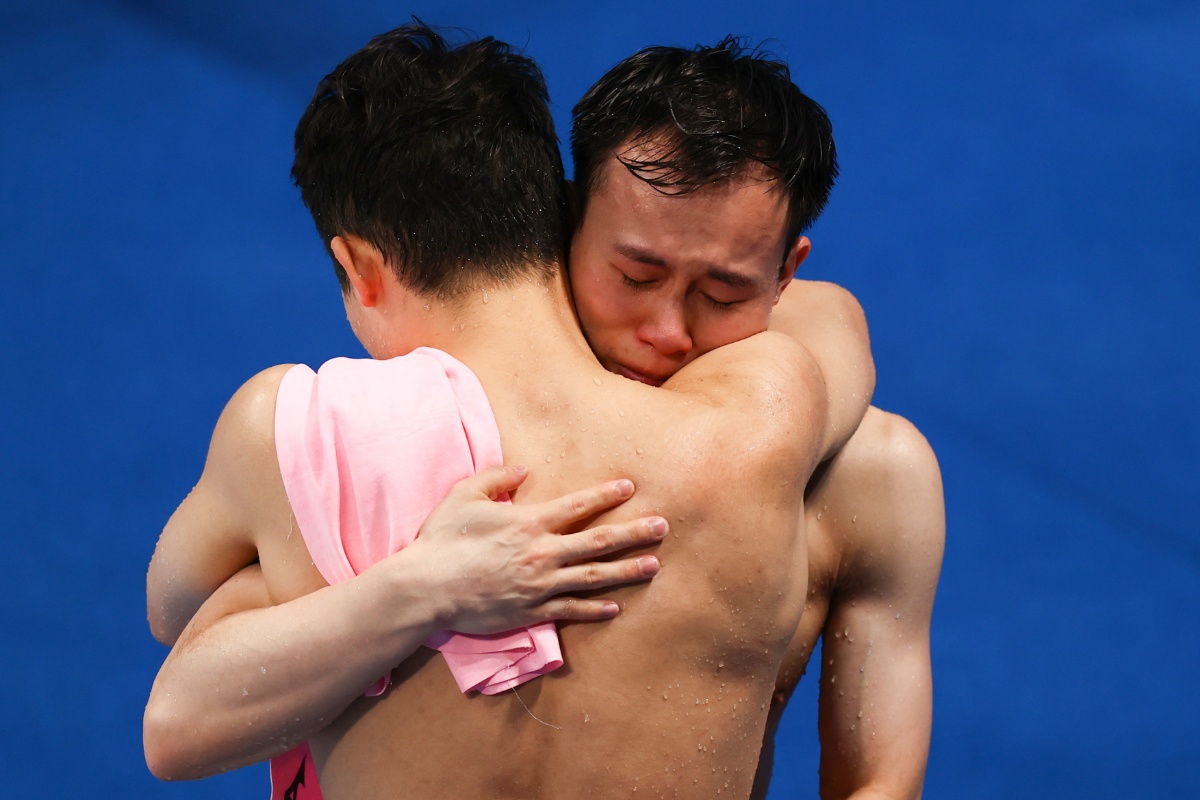 当地时间2021年8月3日,日本东京,2020东京奥运会跳水男子3米跳板决赛赛况。谢思埸落泪,王宗源安慰